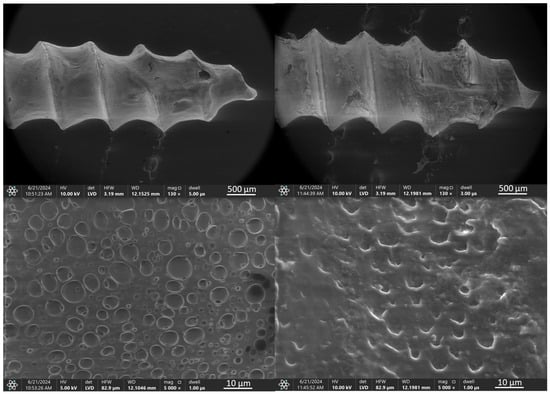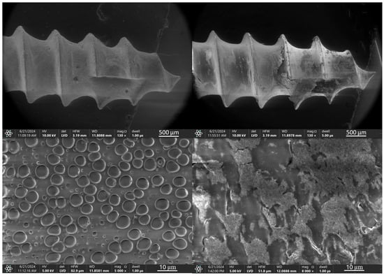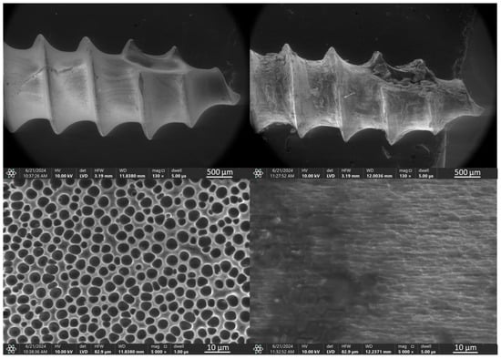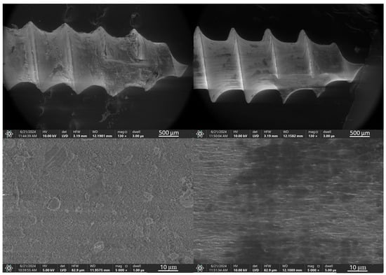 In the case of the orthodontic micro-implant coated with a TiNP layer and an additional PLA layer, shown in Figure 4, the transparent PLA layer before the ex vivo simulations is visible at higher magnification only due to the presence of bubbles, located primarily in the spaces between the thread edges. Microscopic analysis of the TAD micro-implant after the ex vivo simulation test (Figure 4, right) confirmed that the additional PLA protective layer significantly improved the protection of the underlying EPD base layer. However, coating discontinuities after the ex vivo simulation tests were observed primarily at the thread edges and at the implant tip.