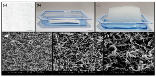 Porcine dermal collagen matrix: (a) Dense sheet type for covering; (b) Porous sheet type for tissue augmentation before rehydration; (c) Porous sheet type for tissue augmentation after rehydration (Scale bars: 1 cm). SEM images of porous collagen structure: (d) ×100 magnification (dotted scale bar: 300 μm); (e) ×200 magnification (dotted scale bar: 150 μm); (f) ×500 magnification (dotted scale bar: 60 μm).
