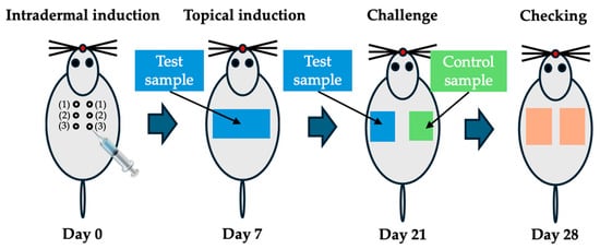 A testing sample with an extraction vehicle (6 cm2/mL, n = 5) was incubated at 37 °C for 72 h with gentle agitation. After centrifugation at 3000 rpm for 10 min, the collected extracts were filtered with a 0.45 μm filter. The intrascapular (shoulder) region of each guinea-pig was shaved to expose an area of approximately 4 cm × 6 cm. Extract (0.1 mL) was injected intradermally into the dorsal scapular region for the intradermal induction phase (Figure 2).