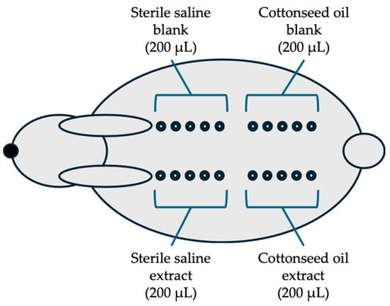 Arrangement of the injection sites in rabbits: The five injections (200 μL each) of each group (saline extract, saline blank, cottonseed extract, and cottonseed blank) are on one side of the spine of each rabbit (n = 3) and observed at 24, 48, and 72 h after injection.