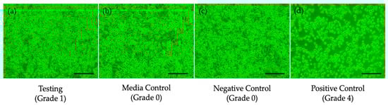 Microscopy of cell morphology at 24 h after treatment: (a) testing sample extract-treated cells (Grade 1), (b) medical control (Grade 0), (c) negative control (Grade 0), (d) positive control (Grade 4, scale bar: 50 μm).