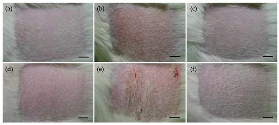 Photograph of individual skin reaction in Dunkin Hartley Guinea pigs. (a–c) 24 h after challenge, (d–f) 48 h after challenge, (a,d) negative control, (b,e) positive control, (c–f) test sample extract-treated animals (scale bar: 1 cm).