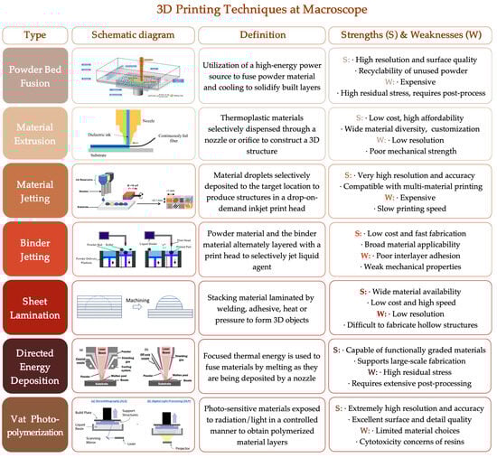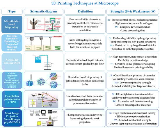 | 3D Printing + Electrospinning | Integration with or post-printing electrospinning; deposition of micro/nanofibers for ECM-like surfaces. | ECM-mimetic topology, enhanced cell adhesion/proliferation; enables multilayer composites. | Weak interfacial bonding, difficult to control fiber orientation; insufficient mechanical strength, limited load-bearing capacity. | [191,192,204] |