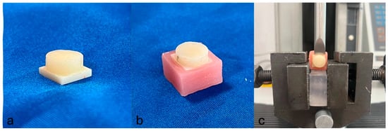 After cementation, the specimens were stored in distilled water at 37 °C for 24 h to simulate the moist and stable temperature conditions of the oral environment in vitro and to ensure complete polymerization and stabilization of the mechanical properties of both the core build-up materials and the resin cement. Subsequently, a mold was prepared using type C silicone (Zhermack, Italy) for embedding the specimens in acrylic resin (Ivoclar Vivadent, Liechtenstein). The cemented and water-stored specimens were embedded in acrylic blocks so that half of the thickness of the monolithic zirconia remained exposed above the acrylic surface (Figure 1b).