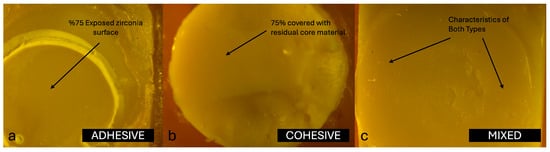 Figure 2. (a) Adhesive failure, (b) Cohesive failure, and (c) Mixed failure pattern of zirconomer group at 10× magnification of a stereomicroscope.