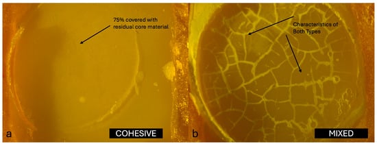 In addition, all specimens were examined for failure modes. Each specimen was evaluated and classified according to semi-quantitative criteria as one of three failure types: adhesive (score 0, >75% of the failure surface exposed), cohesive (score 2, >75% covered with residual core material or fracture within the core material), or mixed (score 1, neither criterion fully met). The evaluations were carried out using a stereomicroscope (LEICA MZ12, Leica Microsystems, Wetzlar, Germany) at 10× magnification. All specimens were evaluated and classified by a single experienced examiner (E1) who had previously participated in similar studies. Prior to the main evaluations, E1 underwent a calibration session using a set of representative stereomicroscopic images. A predefined scoring guide was used, including explicit decision rules and a visual aid to estimate the 75% threshold for class assignment (adhesive, cohesive, mixed). Standardized imaging conditions (magnification, illumination, and working distance) were established and maintained for all observations.