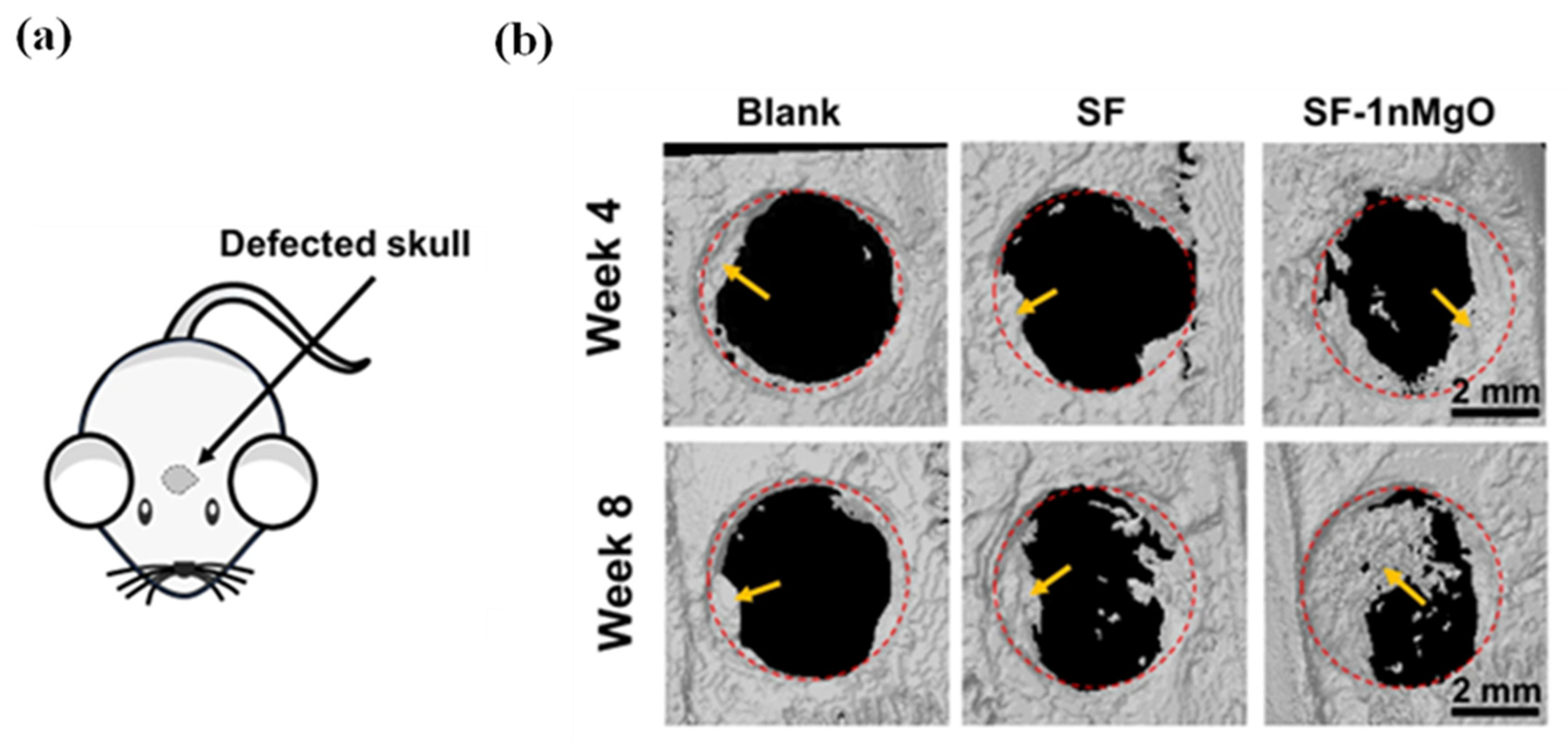 3.2.2. Impact of Bombyx mori Silk Fibroin Scaffold Architecture on Bone Regeneration
