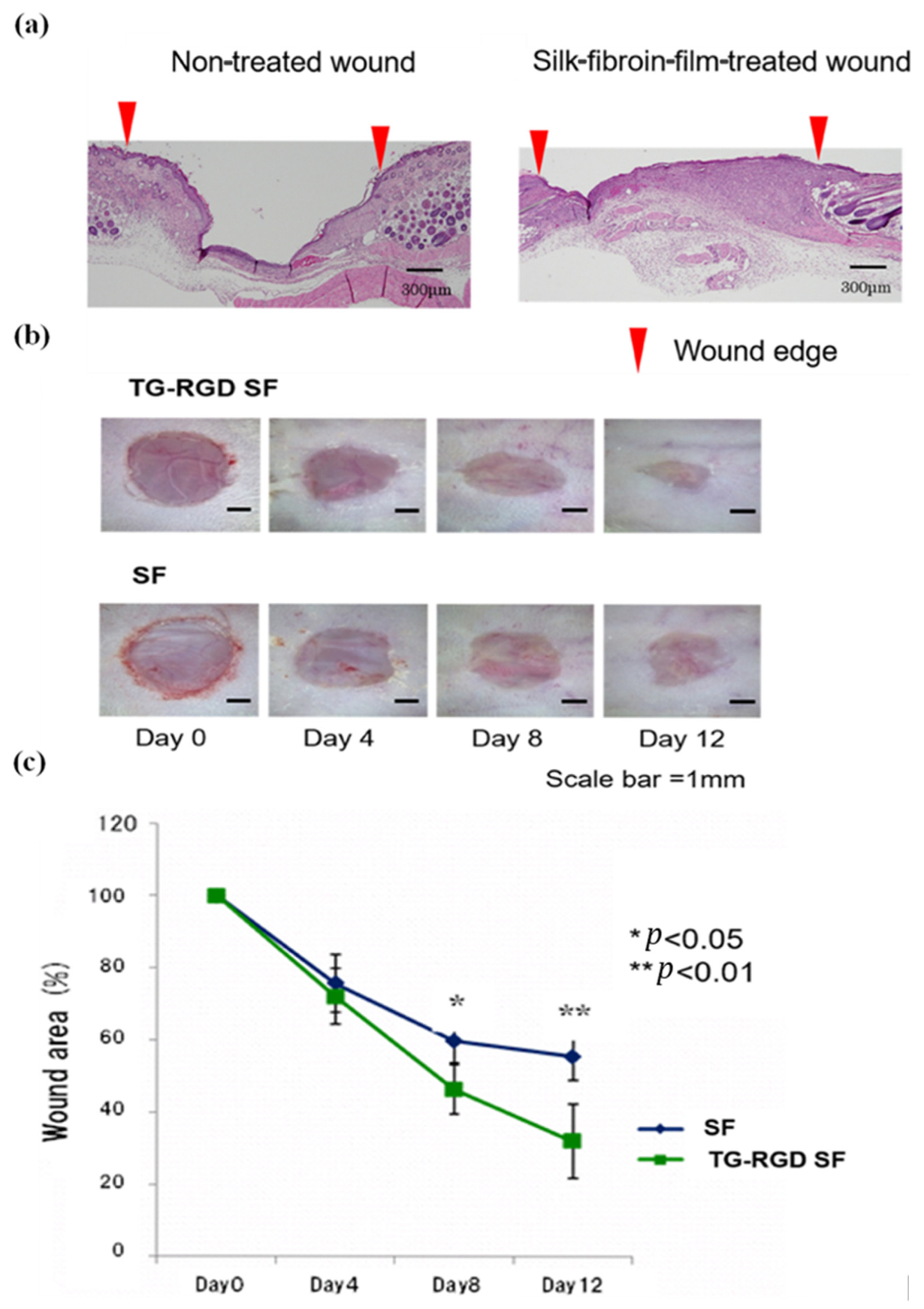 3.3.1. Bombyx mori Silk Fibroin Is a Promising Biomaterial for Skin Healing