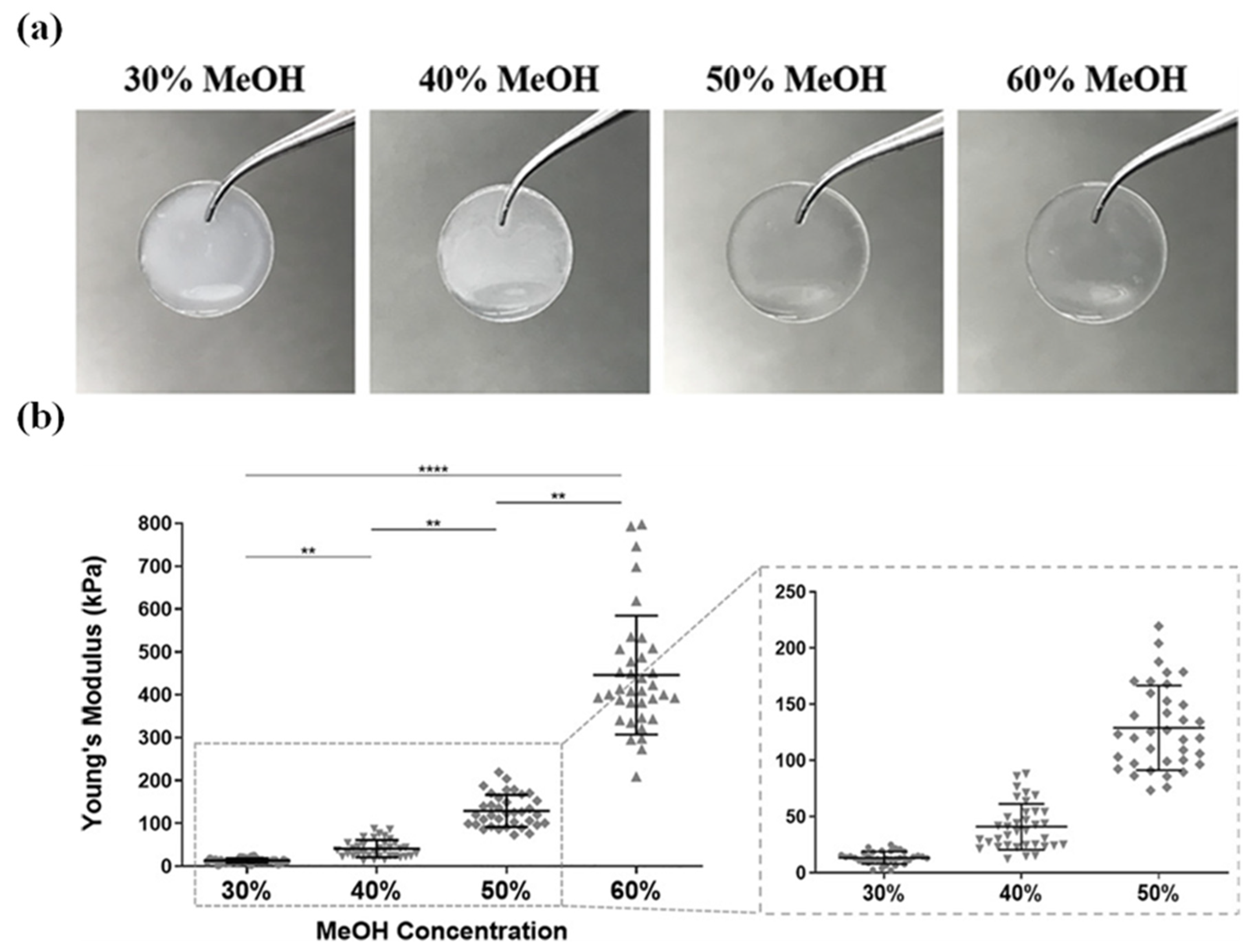 - Sun, M.G.; Luo, Y.; Teng, T.; Guaiquil, V.; Zhou, Q.; McGinn, L.; Nazzal, O.; Walsh, M.; Lee, J.; Rosenblatt, M.I. Silk Film Stiffness Modulates Corneal Epithelial Cell Mechanosignaling. Macromol. Chem. Phys. 2021, 222, 2100013. [Google Scholar] [CrossRef]