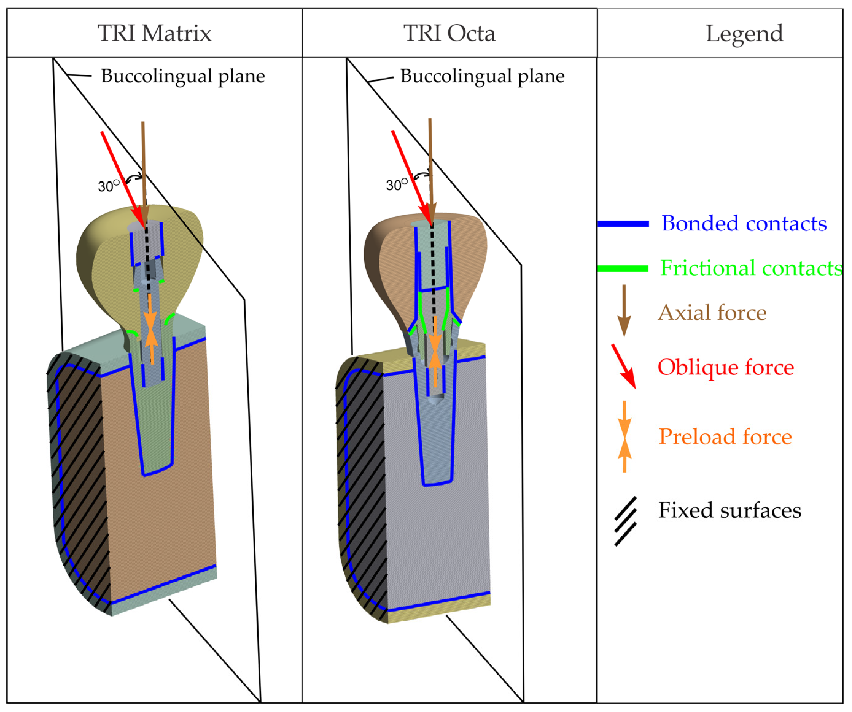 Critical interfaces were modeled as nonlinear frictional contact (μ = 0.10), with an Augmented Lagrange algorithm and small-sliding formulation. In the TRI Matrix assembly, potential initial microclearance at one interface could alter the hierarchy of contact engagement and the load path. The adopted μ represents a relatively low-friction condition consistent with commonly used implant FEA assumptions and a controlled contact definition. Clinically, higher friction (μ ≈ 0.2–0.3) may occur under drier tightening or different surface conditions, which, under torque-controlled tightening, would be expected to reduce the achieved preload for the same applied torque and potentially increase interfacial micromobility, particularly relevant for abutment-free connections. In the present simulations, preload was imposed as a bolt pretension (812 N), so μ mainly influences interfacial stick–slip and shear transfer (and, thus, local stress peaks), rather than the magnitude of the clamping force. As the same μ was applied across all configurations, comparative differences are expected to remain similar; however, without a dedicated sensitivity analysis, changes in absolute peak stresses or hotspot locations cannot be excluded, so maximum values should be interpreted cautiously.