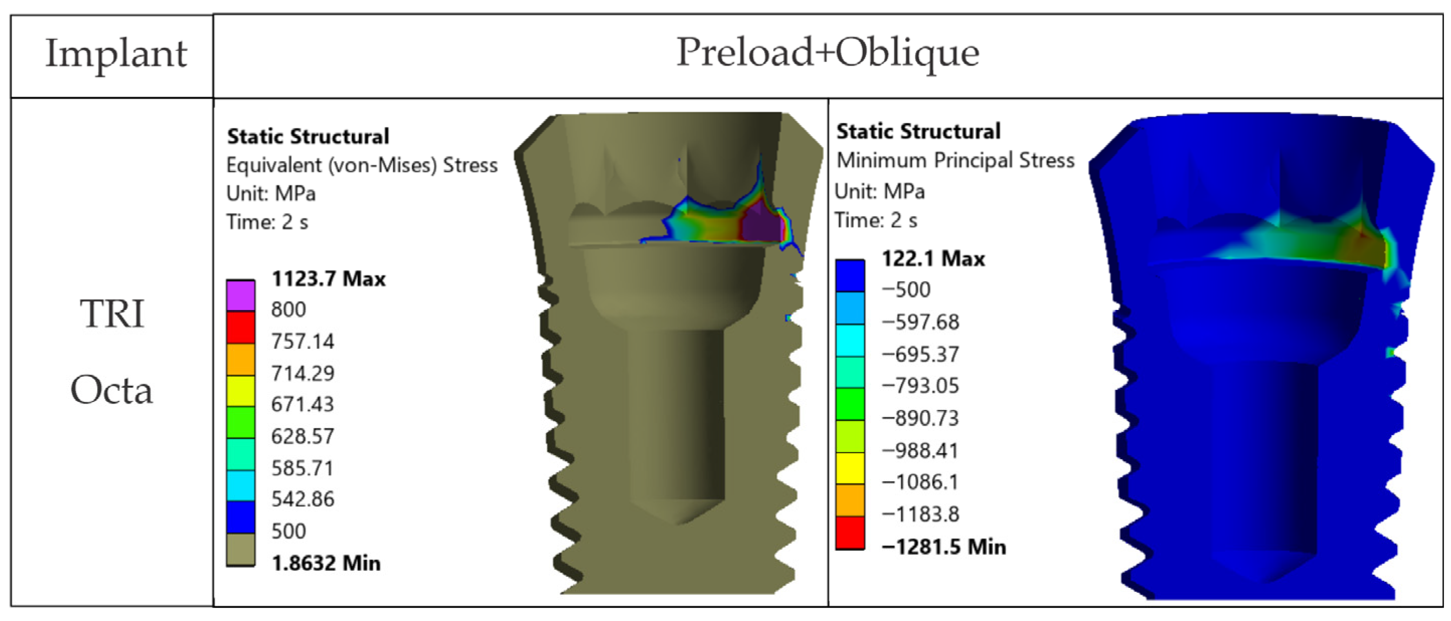 53]. Because cortical and trabecular bone were modeled as homogeneous and isotropic, the stresses predicted at the implant neck may not fully reflect the behavior of real cortical bone, which is structurally directional. Under oblique loading, bending forces accentuate these local stiffness variations, which can affect both the magnitude and the spatial extent of the cortical hotspot at the implant neck/cortical interface. Even so, all configurations in this study were analyzed using the same material assumptions, so any deviation in absolute values would affect them in the same way. For this reason, the simplification does not alter the comparative interpretation of the results or the relative differences observed between the Matrix and Octa assemblies. However, the model should not be used to infer bone-strain thresholds, remodeling, or marginal bone-loss predictions.