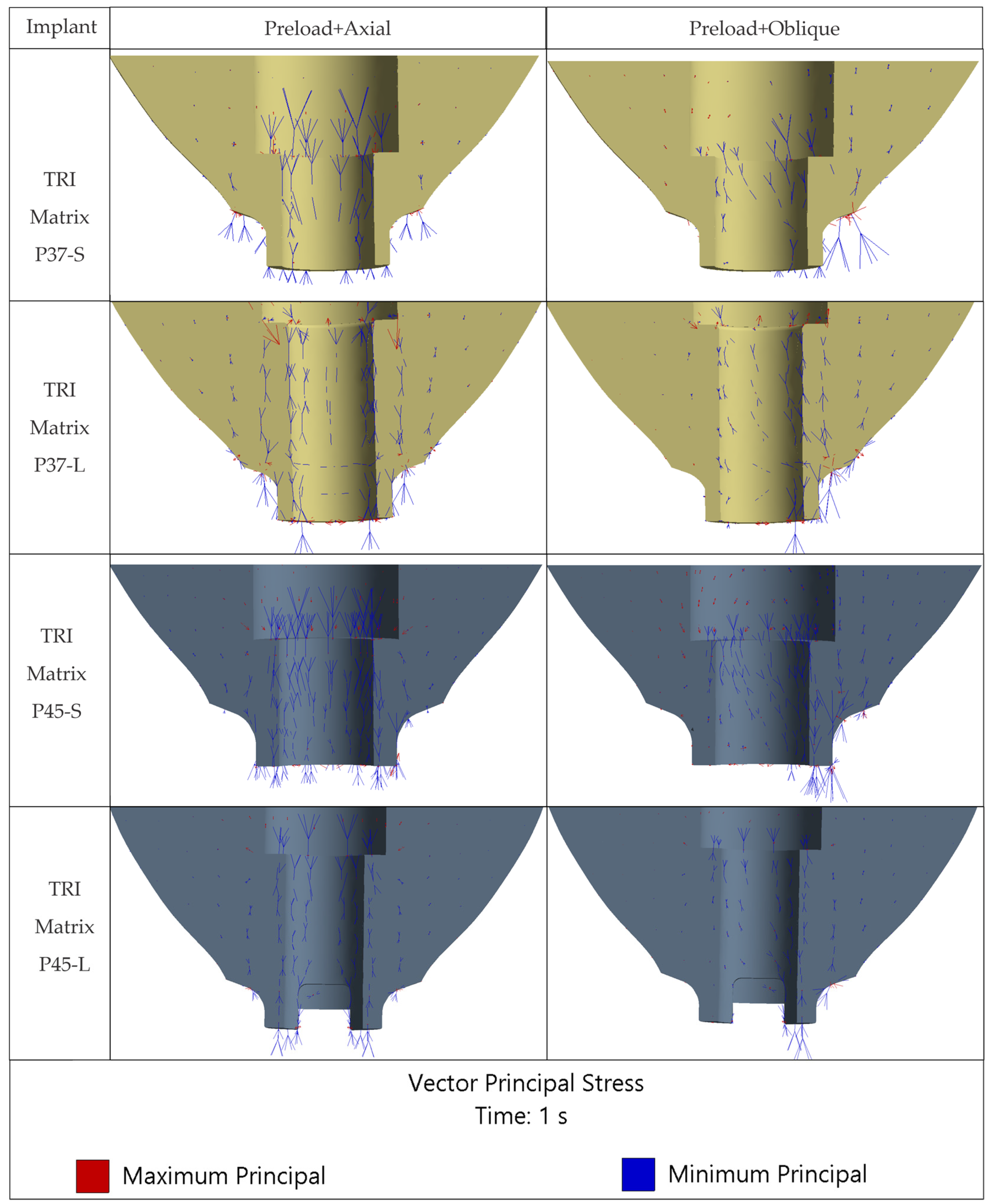25]. Intra-brand FEA comparisons of a tissue-level, abutment-free implant, with a direct-to-implant crown design, and a classic tissue-level implant with a Ti-base approach, under identical numerical hypotheses that explicitly address platform width (P37 vs. P45) and screw length (short vs. long) using standardized axial/oblique loads remain uncommon [