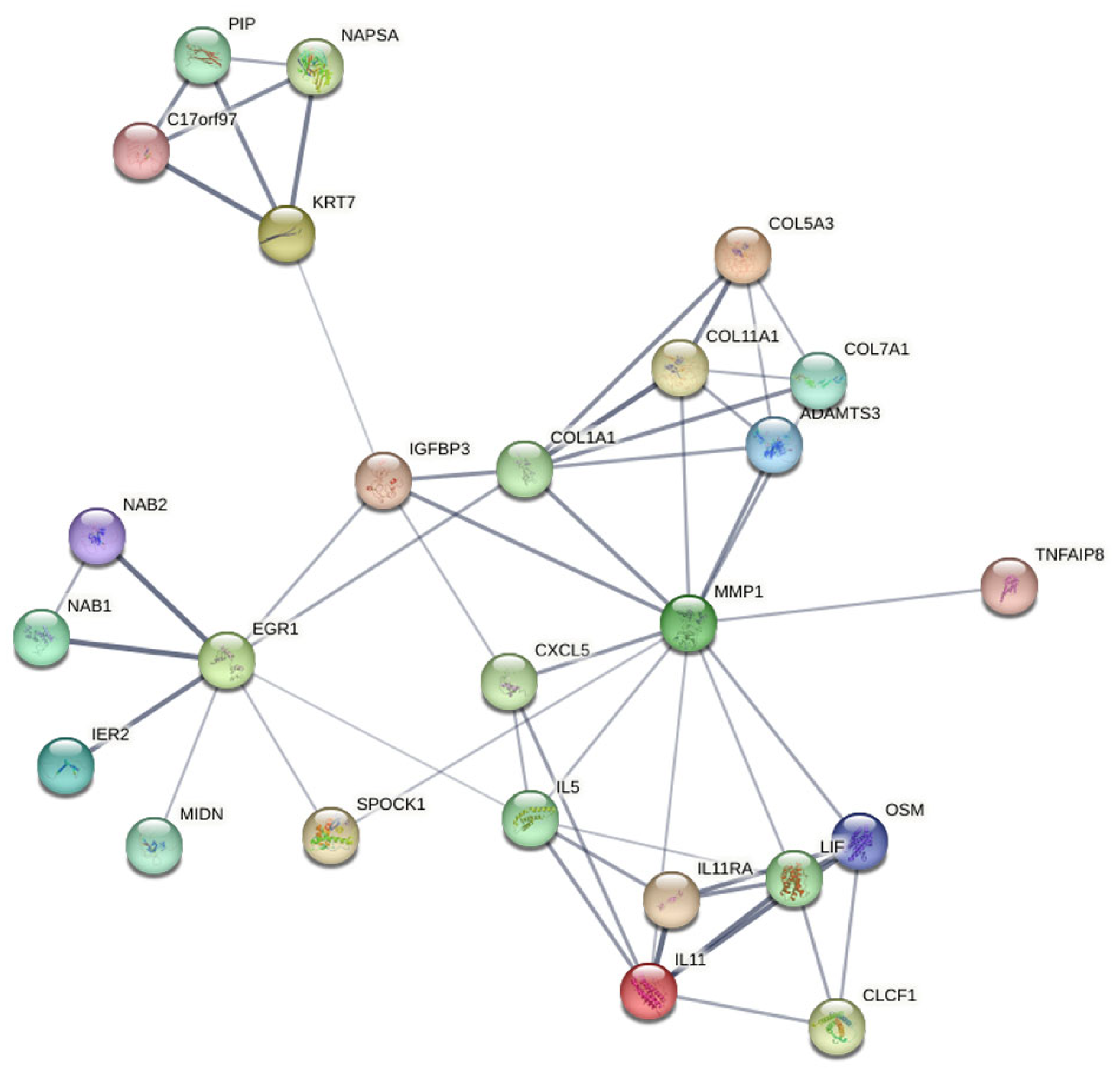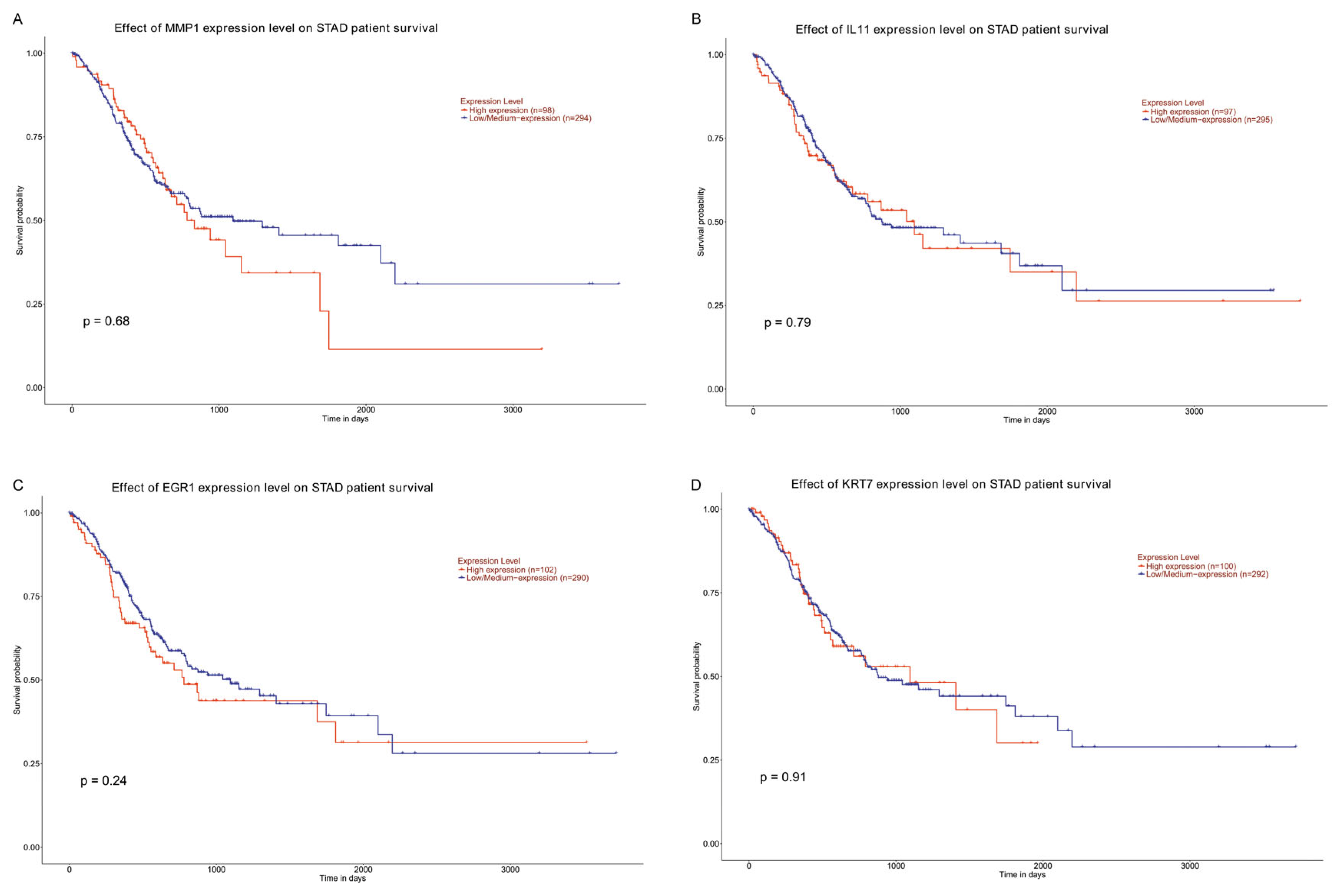 3.6. MMP1, IL11, EGR1, and KRT7 Expression Correlates with GC Prognosis
