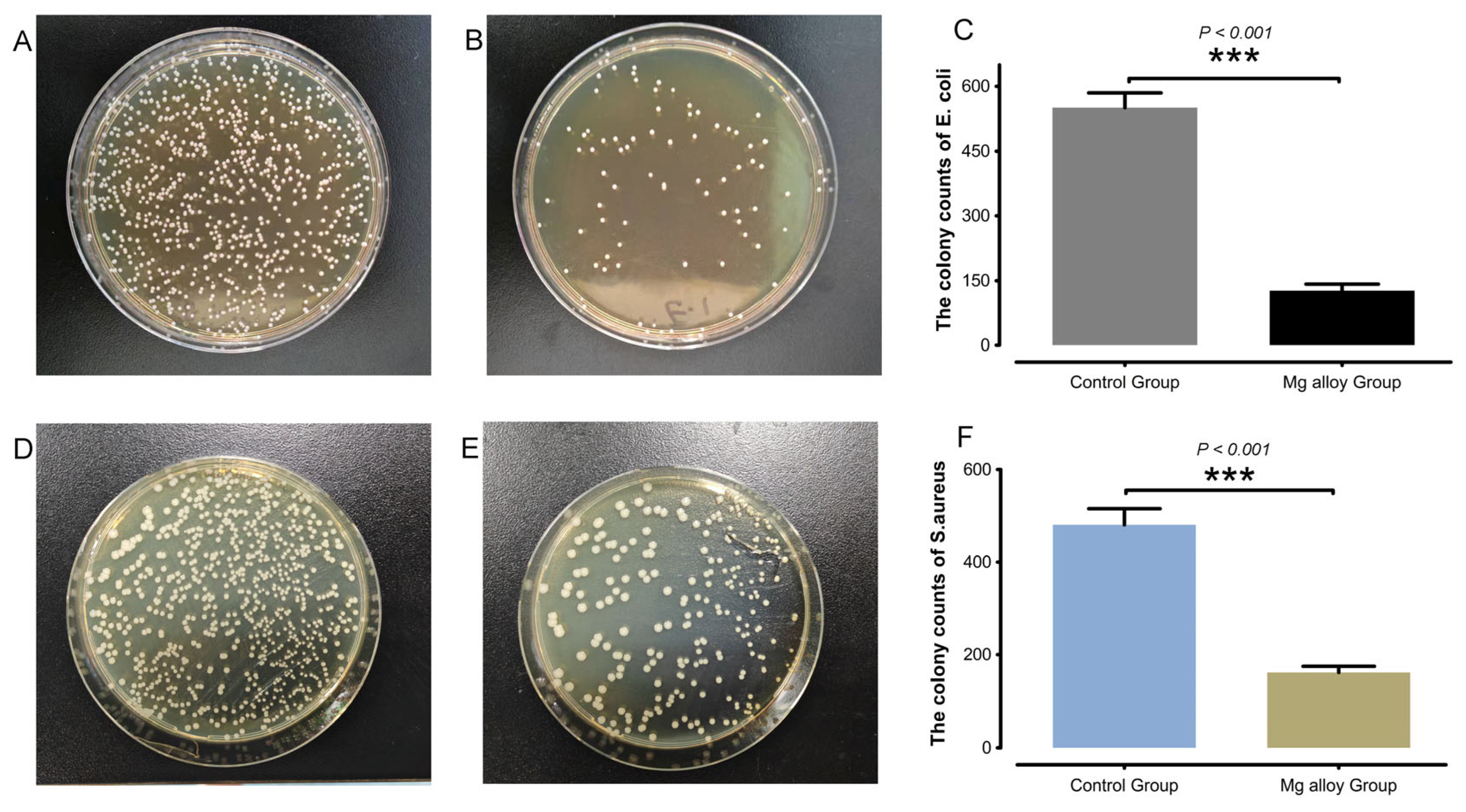 3.8. Mg Alloys Inhibited Growth in Three Types of Pathogenic Bacteria