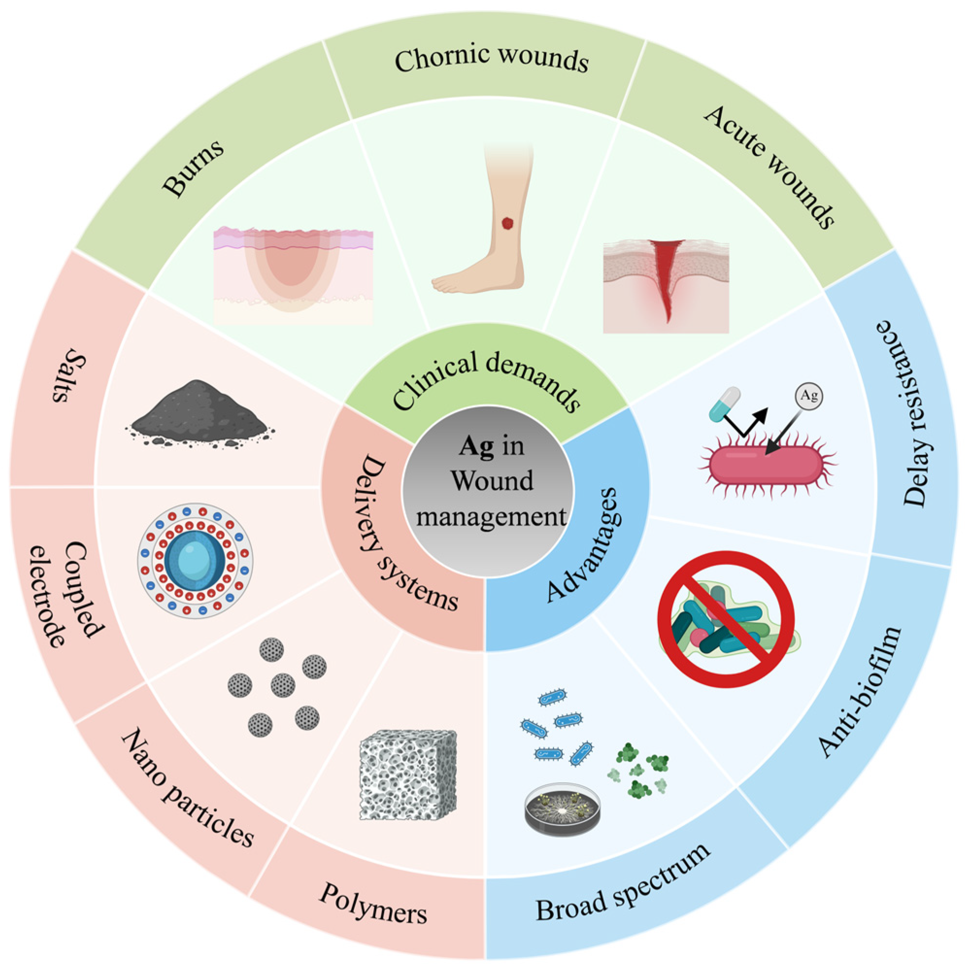 - Liang, K.; Liu, Y.; Jiang, F. Analysis of Therapeutic Effect of Silver-Based Dressings on Chronic Wound Healing. Int. Wound J. 2024, 21, e70006. [Google Scholar] [CrossRef]
