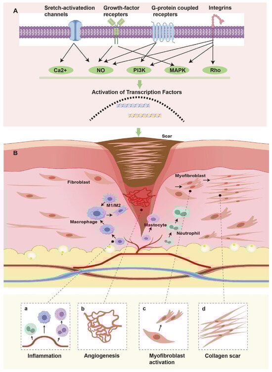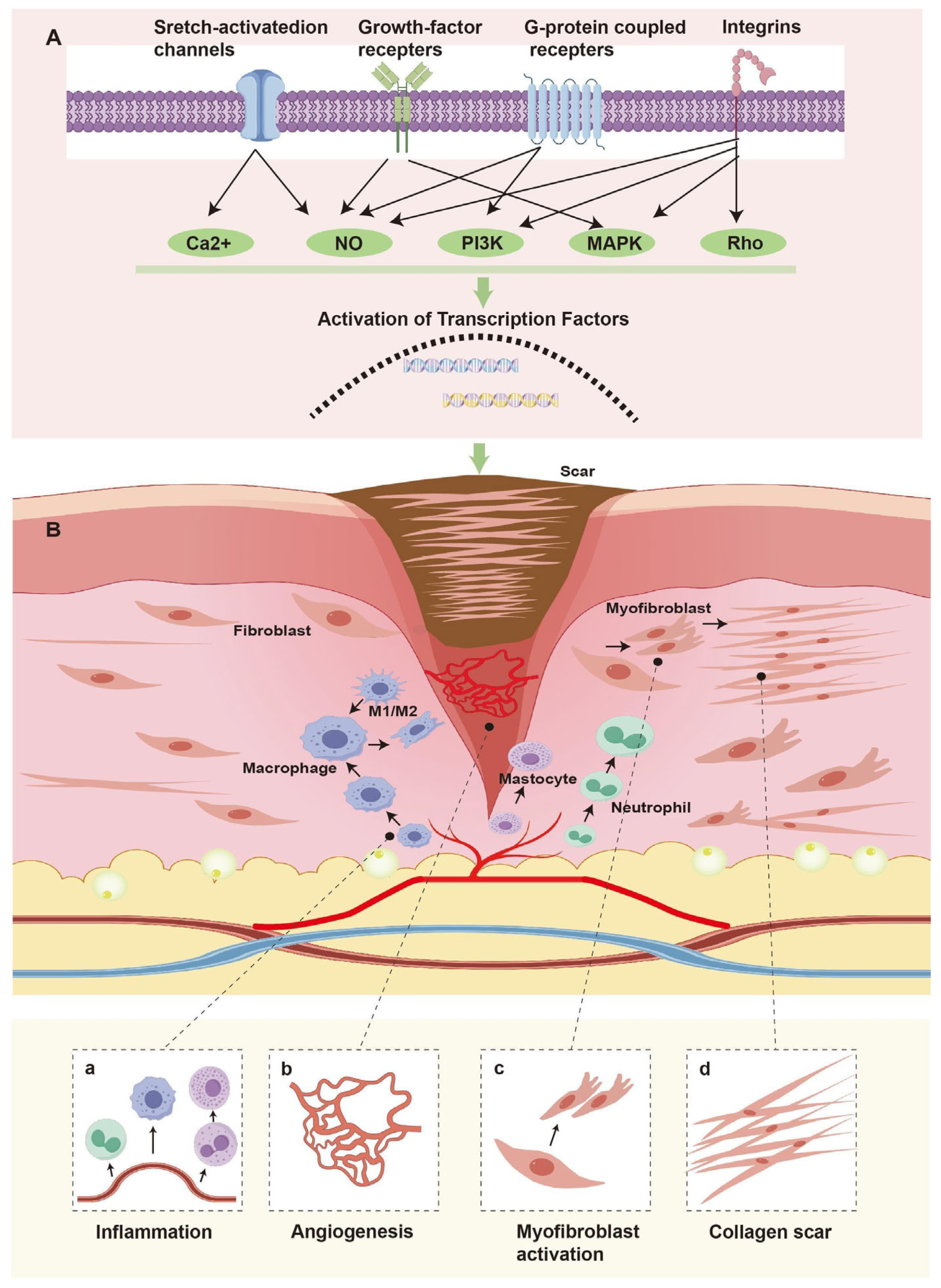 | Integrin | Increased wound tension (Mechanotransduction) | Transduces mechanical force into chemical signals, promote fibroblast activation and fibrosis. | [19,20] |