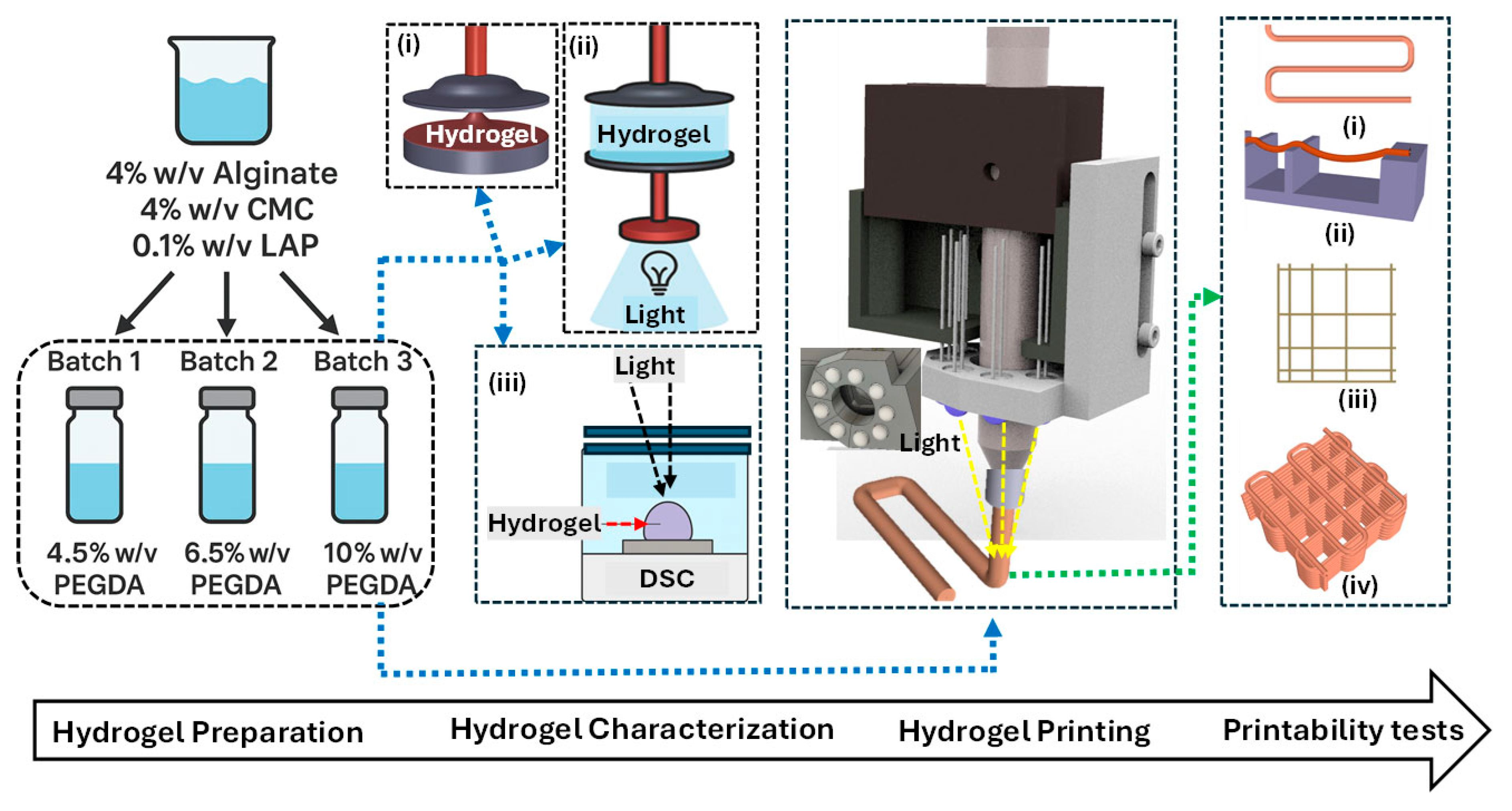 Rohauer, R.; Schimmelpfennig, K.; Woods, P.; Sarah, R.; Habib, A.; Lewis, C.L. Photo Crosslinkable Hybrid Hydrogels for High Fidelity Direct Write 3D Printing: Rheology, Curing Kinetics, and Bio-Scaffold Fabrication. J. Funct. Biomater. 2026, 17, 30. https://doi.org/10.3390/jfb17010030