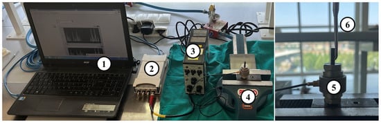 Experimental test setup: (1) laptop equipped with LabVIEW SignalExpress, (2) data acquisition system (DAQ), (3) signal amplifier, (4) bench vise, (5) piezoelectric load cell, (6) Magnetic Mallet bridge remover tip, inserted in a load-bearing screw equipped with a transverse hole.