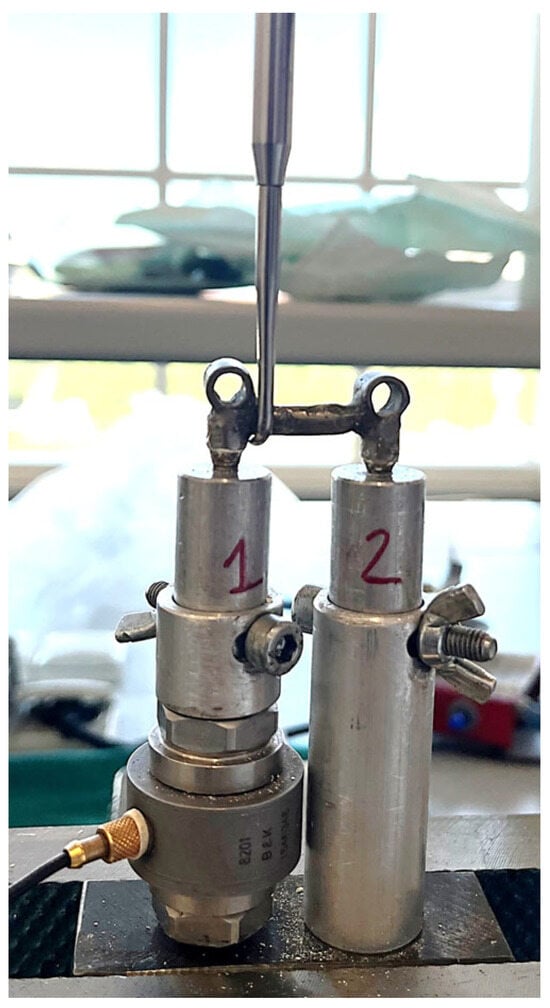 When removal of cement-retained implant-supported crowns or bridges is indicated, several instrument classes are available: manual devices (e.g., sliding hammers), pneumatic/mechanical percussive systems driven by compressed air (e.g., Coronaflex), and devices generating magneto-dynamic impulses (e.g., Magnetic Mallet). Despite their widespread clinical use, limited information is available in the literature about quantitative data on impulse forces, operator variability, and the comparative performance of different instruments. Studies focus on evaluating the removability in relation to the abutment height, the taper angle of its axial walls, surface roughness, the material used for the realization of the abutment itself, and the type and thickness of the luting agent film (glass ionomer, zinc phosphate, zinc oxide, polycarboxylate, composite resin cements). Experimental data on removability are primarily obtained through uniaxial tensile tests conducted in vitro exploiting universal testing machines, without the use of clinical devices [29,30,31,32,33,34]. Few studies utilize in their experimental tests a device used in clinical procedures (Coronaflex), comparing the data with those obtained from universal testing machines, without conducting comparisons between multiple clinical devices [35,36,37]. Identifying the optimal tool for the removal of fixed prosthesis cemented on implant prosthetic abutments is essential to minimize the risks of damaging the implant prosthetic components and maximize the patients’ comfort during the procedure [38,39]. Therefore, the aim of this study was to compare three clinical retrieval tools—sliding hammer, Coronaflex, and Magnetic Mallet—under standardized conditions. The primary outcome was instrument efficiency, assessed by the percentage of successful removals and the maximum force generated during disassembly. Secondary observations included potential implant damage.