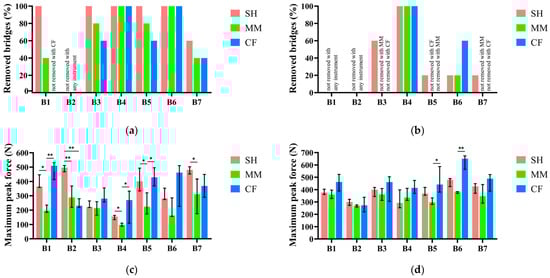 Percentage of complete bridge removals within 50 impulses. Results obtained with Temp Bond NE (a) and Harvard Cement (b). Medians and variability range (25th and 75th percentiles) of the maximum peak force measured during bridge retrieval attempts: results obtained with Temp Bond NE (c) and Harvard Cement (d). Asterisks above the bars indicate statistically significant differences (** p < 0.05; * p < 0.1). Each bar triplet represents, left to right, the data about Sliding Hammer (SH), Magnetic Mallet (MM), and Coronaflex (CF). Additional data is available in the Supplementary Materials (Tables S3–S8).