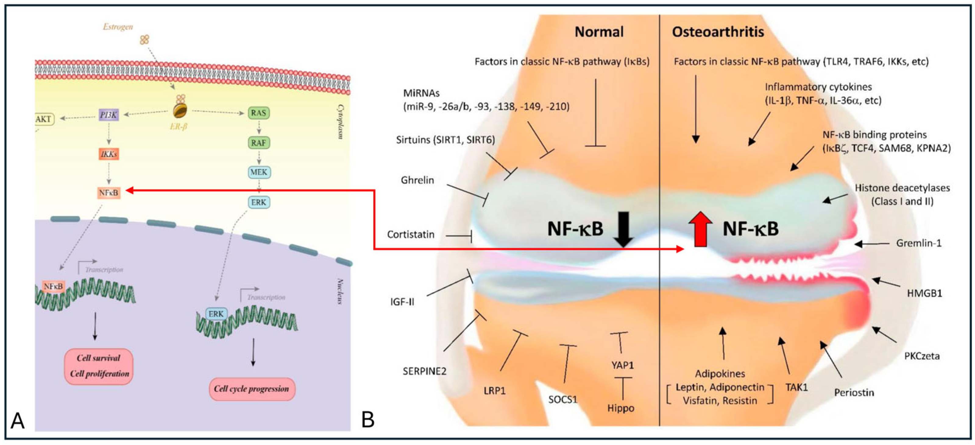 | Estrogen (E2) | Regulates osteoclastic activity; promotes cartilage stability. Post-menopausal reduction is associated with accelerated joint degeneration. | Lower direct impact; Indirect influence via testosterone aromatization | ER-α—Regulation of osteoblast and osteoclast activity (MAPK, ERK); ER-β—Modulation of inflammatory cytokine production in chondrocytes and synovial tissue (NF-kB, IL-1β, TNF-α); |