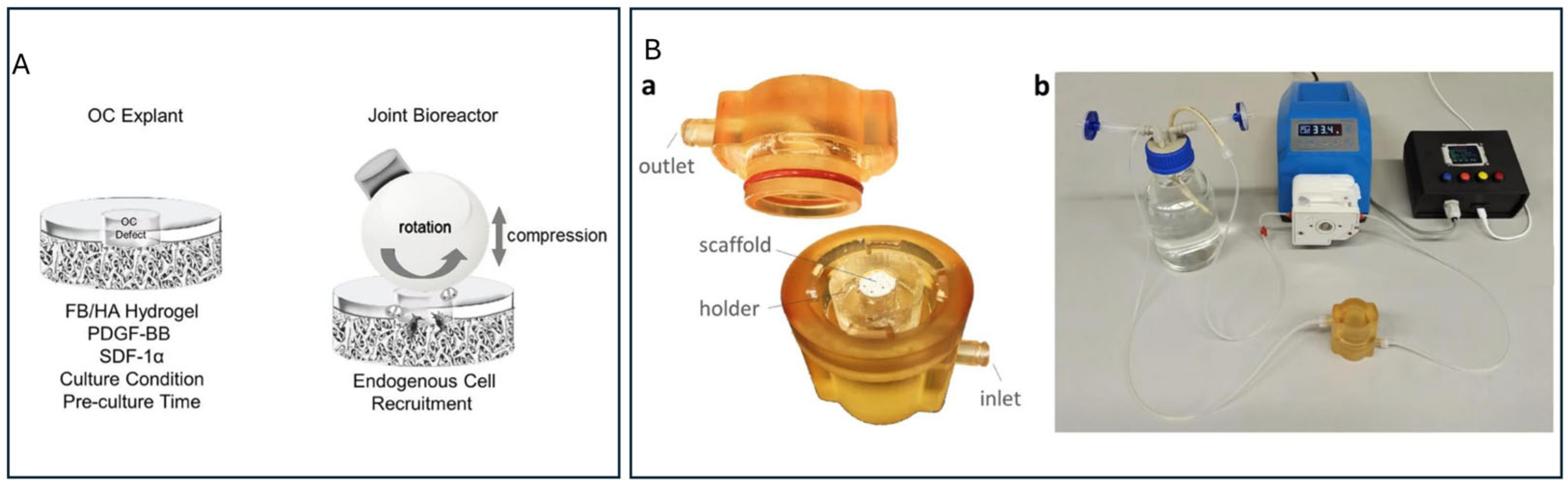 | Bioreactors | Enable dynamic compression, shear, and hydrostatic pressure; support tissue maturation | Difficulty reproducing multiaxial joint forces; limited scalability and reproducibility |