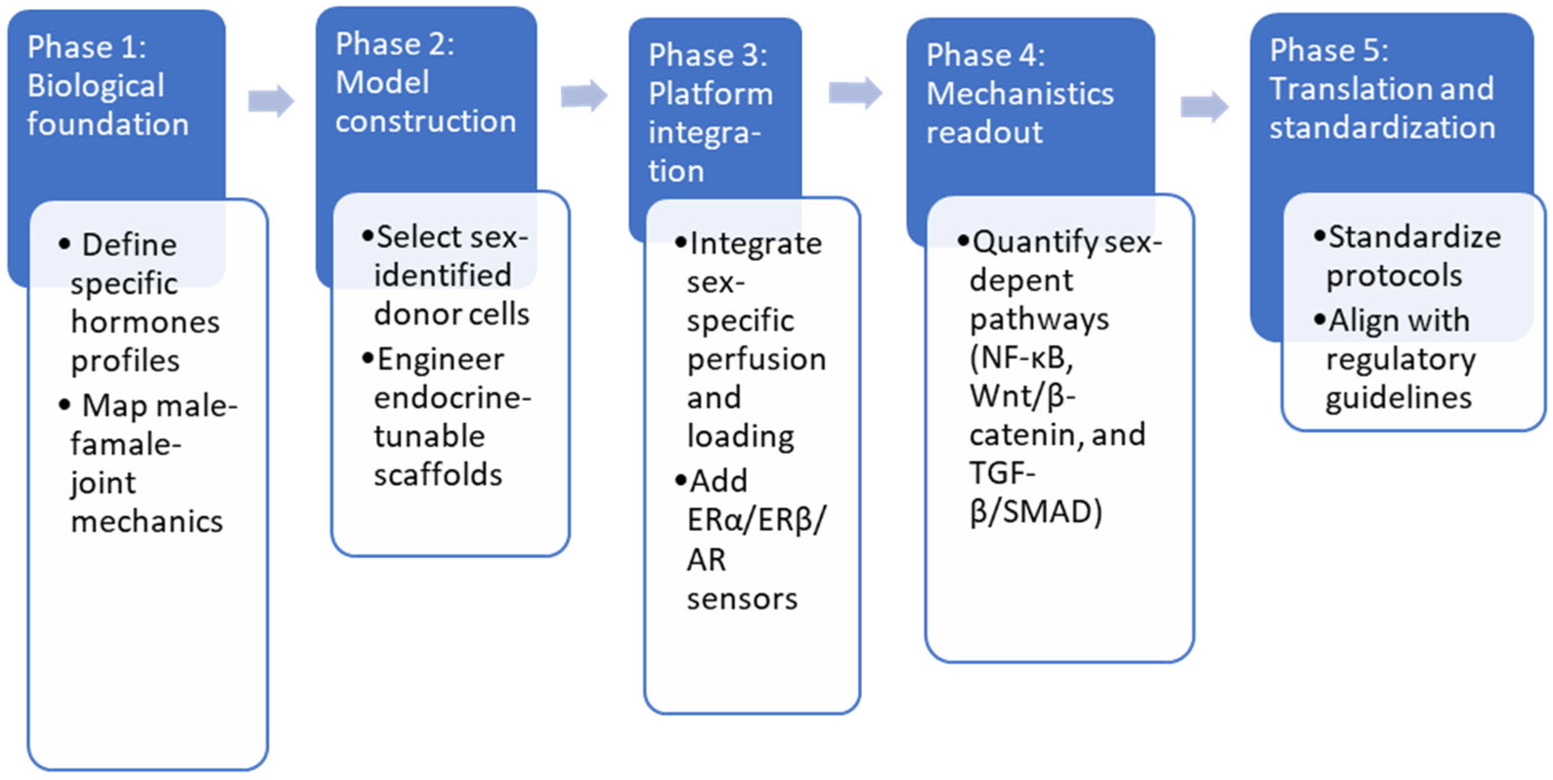 | Microfluidic JOC | Dynamic co-cultures of cartilage, bone, and immune cells with controlled shear [136,137,138,139,140]. | No incorporation of estrogen/testosterone fluctuations; absence of sex-dependent hormonal gradients. |