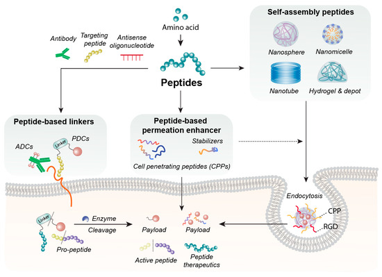 Applications using peptide-based biomaterials. Peptides composed of amino acids can self-assemble into diverse nanostructures, including nanospheres, nanomicelles, nanotubes, hydrogels, and depots, which serve as platforms for pharmaceutical delivery. Peptides also function as peptide-based permeation enhancer—such as cell-penetrating peptides or stabilizing agents—to enhance the cellular permeability or stability of therapeutic molecules. Furthermore, peptide-based linkers can be conjugated to antibodies, targeting peptides, or antisense oligonucleotides, where they are engineered to be cleaved by intracellular lysosomal enzymes such as cathepsins, enabling controlled payload release.