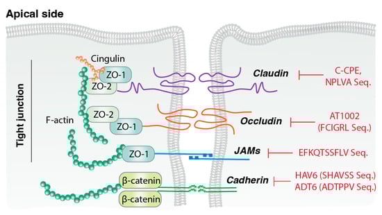 Tight junctions seal the intercellular space between adjacent epithelial or endothelial cells and primarily regulate the absorption of chemicals, solutes, water, and ions, while controlling pathogen translocation and maintaining paracellular permeability. As shown in Figure 2 tight junction proteins are essential for maintaining the structural integrity and barrier function of epithelial and endothelial cell layers and also participate in intracellular signaling pathways that regulate cell proliferation, differentiation, and immune responses [50]. Because of their selective permeability, these proteins are critical for fluid balance and nutrient transport. Claudins are major transmembrane components of tight junctions, with more than 20 identified isoforms. They are key regulators of paracellular barrier formation and selective pore creation, and tissue-specific claudins determine intercellular permeability characteristics [51]. Occludin, a 65 kDa transmembrane protein, contributes to barrier integrity and signal transmission [52]. Junction adhesion molecules (JAMs) are single-transmembrane, immunoglobulin-like proteins involved in intercellular adhesion and leukocyte migration. Zonular Occludens (ZO) proteins (ZO-1, ZO-2, ZO-3) link transmembrane proteins (claudins, occludins, JAMs) to the actin cytoskeleton, and support tight junction assembly, cell migration, proliferation, and barrier formation [53]. In drug delivery, TJMPs transiently and reversibly alter epithelial barriers to enhance drug absorption, particularly for hydrophilic compounds and macromolecules that otherwise display limited permeability [54]. These peptides function by interacting with specific tight junction proteins.