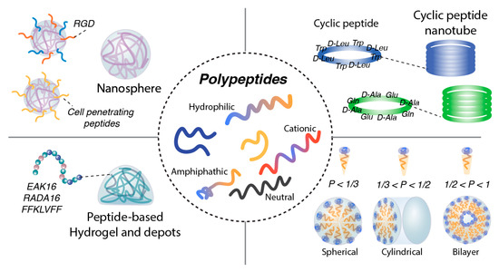 Peptide-based self-assembling nanostructures. Hydrophilic, cationic, neutral, or amphipathic polypeptides can self-assemble into nanospherical structures. Their surfaces can be further modified with targeting motifs such as RGD peptides or cell-penetrating peptides to enhance cellular uptake. Cationic or anionic peptides are also capable of forming peptide-based hydrogels and depot systems. In addition, cyclic peptides can assemble into cyclic peptide nanotubes through directional hydrogen bonding. Peptide micelles exhibit diverse morphologies—including spherical, cylindrical, or bilayer structures—depending on their length and degree of hydrophobicity.