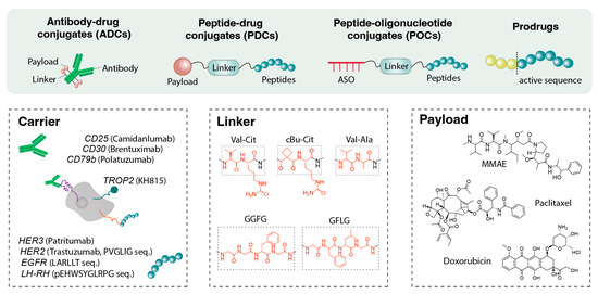 Components of peptide-based linkers. Antibody–drug conjugates (ADCs), peptide–drug conjugates (PDCs), peptide–oligonucleotide conjugates (POCs), and prodrugs utilize peptide-based linkers to connect therapeutic payloads to carriers such as antibodies against CD25, CD30, or CD79b, as well as targeting peptides directed toward HER2 or various growth factor receptors. These peptide linkers are engineered to provide both stability and controlled reactivity, enabling responsive cleavage under specific intracellular or pathological conditions for regulated payload release.