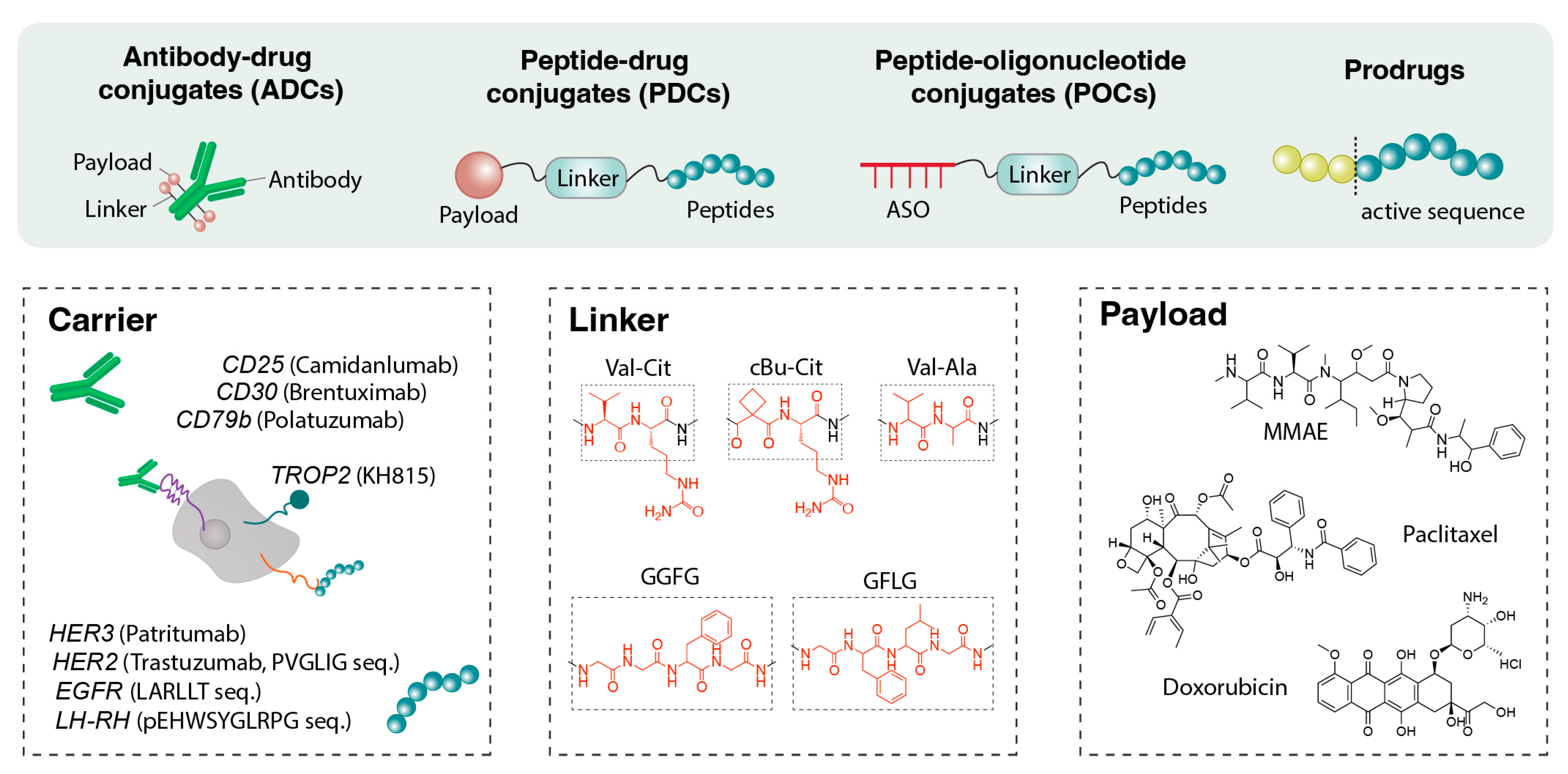 - Li, S.; Guo, Y.; Che, J.; Dai, H.; Dong, X. Recent Advances in Peptide Linkers for Antibody-Drug Conjugates. J. Med. Chem. 2025, 68, 19871–19892. [Google Scholar] [CrossRef]