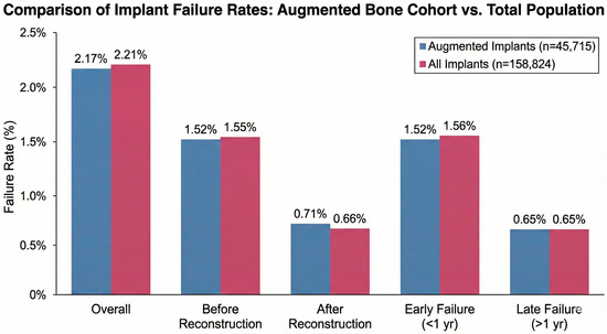Across the entire dataset of 158,824 implants, 3507 failures were recorded. Of these, 2476 (70%) occurred within the first year and 1031 (30%) after more than one year. Similarly, 2455 failures (70%) occurred before reconstruction and 1052 (30%) after reconstruction. between augmented implants and the overall implant population. These comparisons are presented in Figure 2 and Table 1.