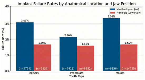 In contrast, failure rates in mandibular regions were lower and relatively uniform, ranging from 1.61% to 1.69% across incisor, premolar, and molar areas.