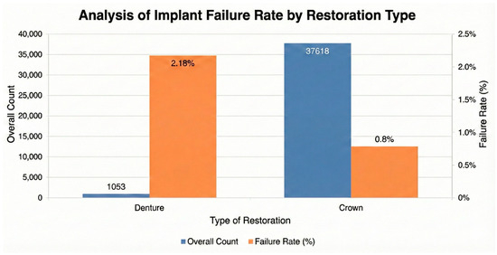 Comparison of overall implant count and failure rate stratified by type of prosthetic restoration (denture vs. crown).