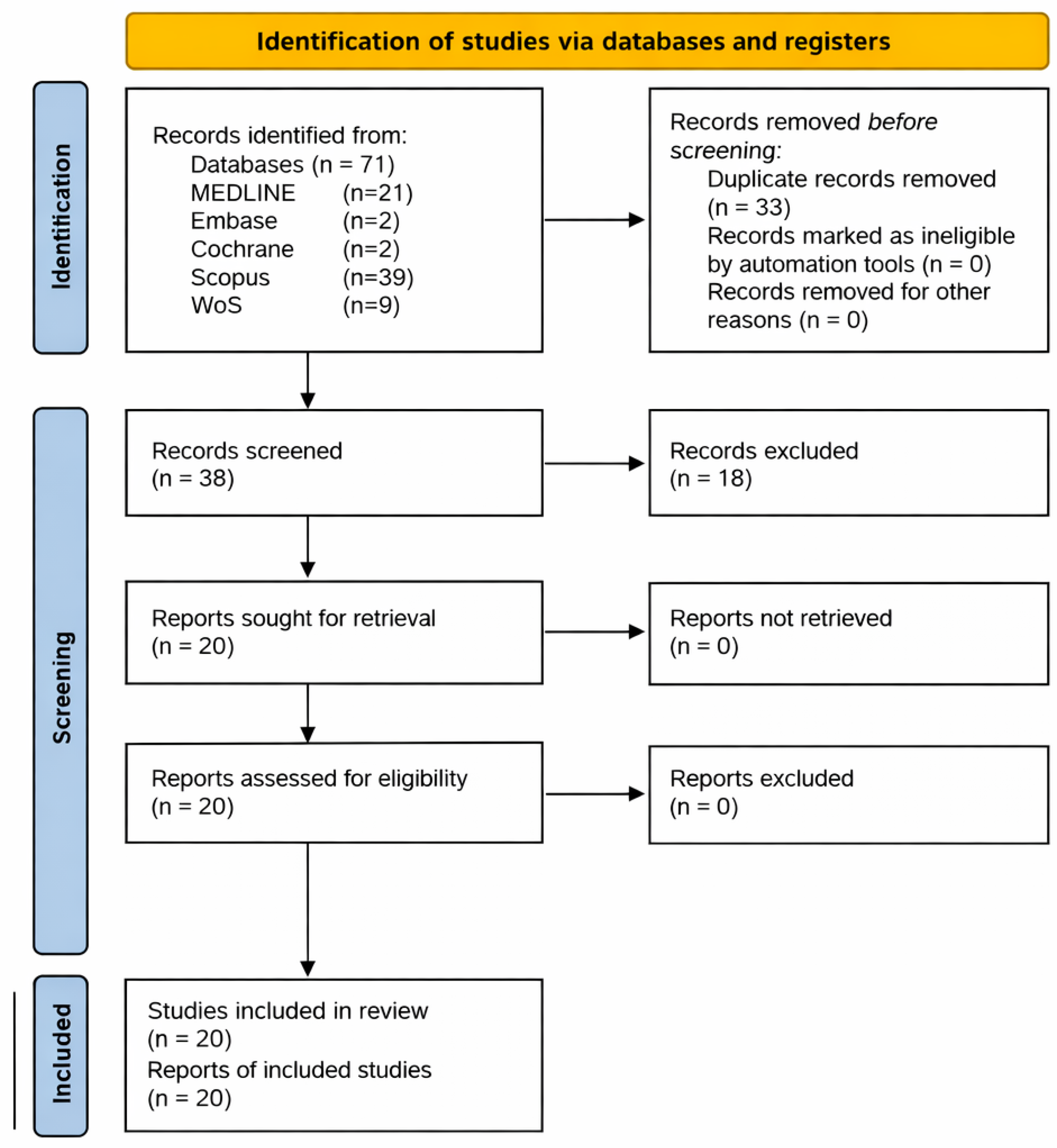 The electronic database search initially identified 71 articles: 21 in PubMed, 2 in Embase, 2 in Cochrane, 39 in Scopus, and 9 in Web of Science. Thirty-three duplicate records were discarded. After screening the titles and abstracts, 18 articles were excluded for not meeting the eligibility criteria. The manual reference search of the included studies did not yield any additional records. 20 articles were evaluated in full text, and all of them were ultimately included in the review. The PRISMA 2020 flow diagram representing the study selection process is illustrated in Figure 1.