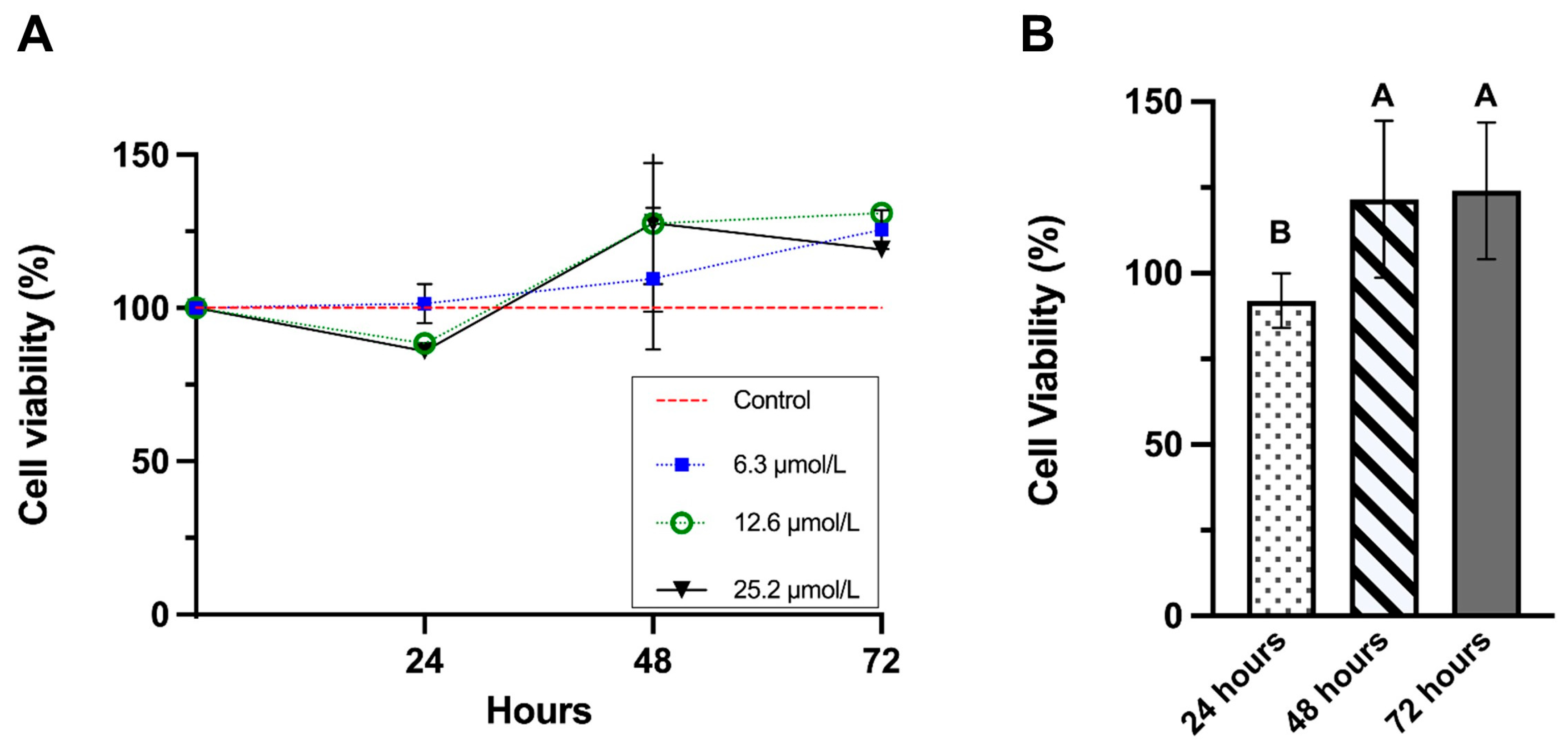 The MTT cell viability assay showed that, despite presenting a slight reduction in viability observed during the first 24 h for the highest concentrations, P
