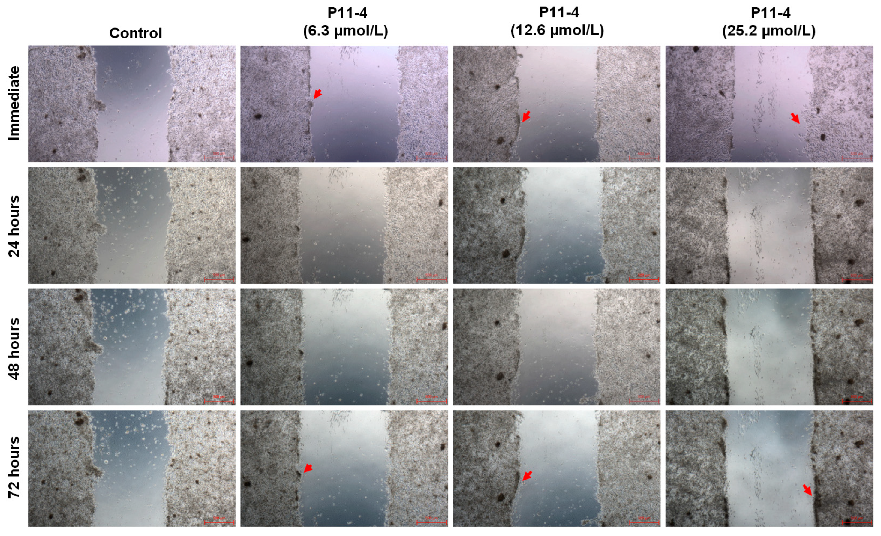 MDPC-23 cells (3.0 × 104) were seeded in 24-well plates and cultured in a humidified incubator at 37 °C with 2.5% CO2 until reaching confluence. To inhibit cell proliferation and ensure that subsequent cell behavior resulted primarily from migration, the cells were pre-treated with mitomycin C (10 µg/mL) diluted in D-MEM without FBS for 1 h. Following treatment, the wells were washed twice with serum-free medium, and the cells were exposed to increasing concentrations of the P11-4 peptide (6.3, 12.6, and 25.2 µmol/L) for the entire experimental period. A linear scratch was then created in the center of each well to define the migration area. All experimental conditions were performed in triplicate for each group. Images were captured at 12, 24, and 72 h using an inverted microscope equipped with a digital camera Axiocam 208 Color (Carl Zeiss, Oberkochen, Germany), acquiring two representative fields per well. One representative field per group for each time point was selected for presentation in the Results section.