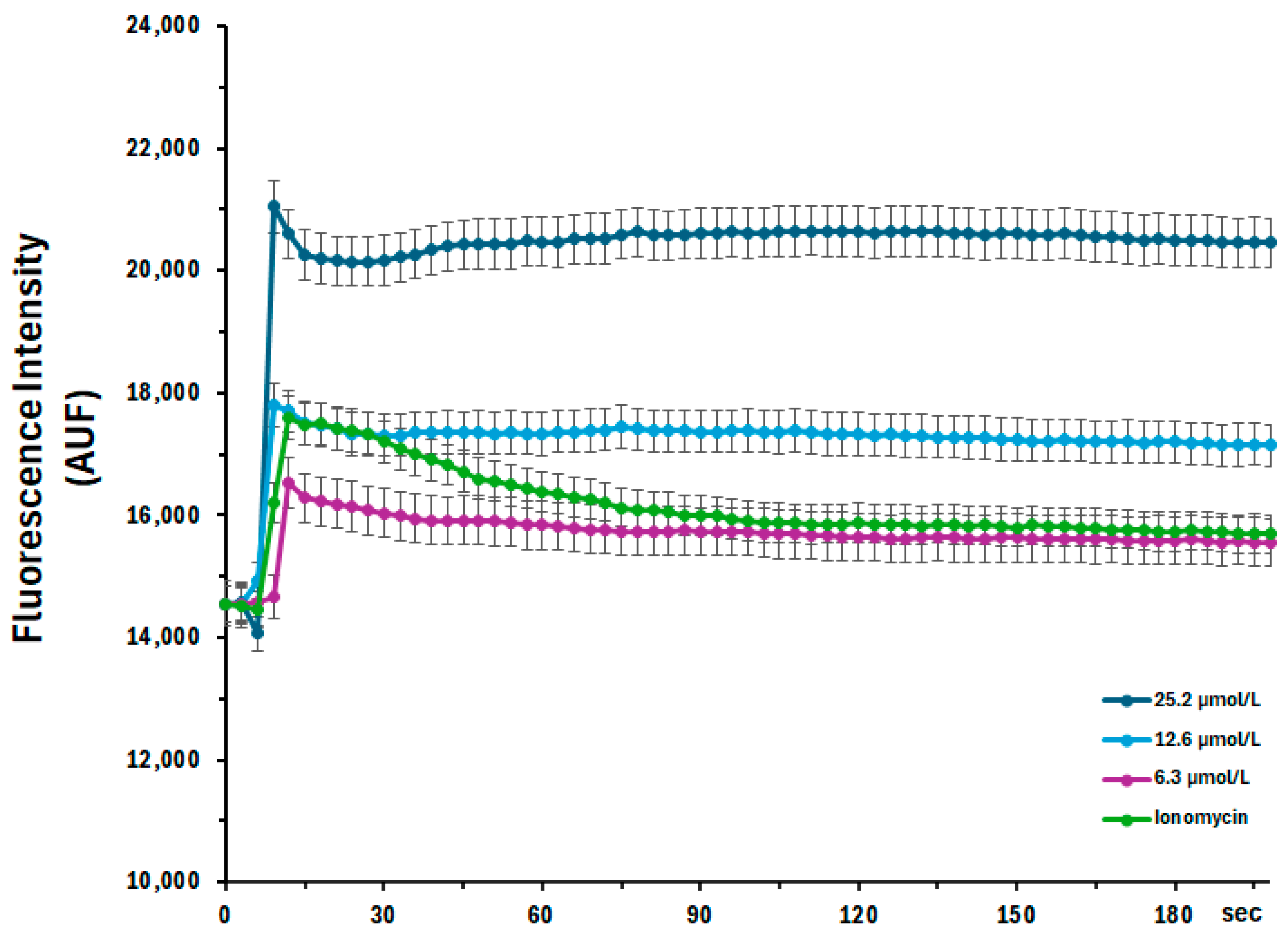 2+ ions are considered a crucial signal in regulating various cellular processes, including cell injury, cell death, and cell differentiation. The intracellular calcium influx assay demonstrates that only the highest concentration tested was able to induce sustained Ca