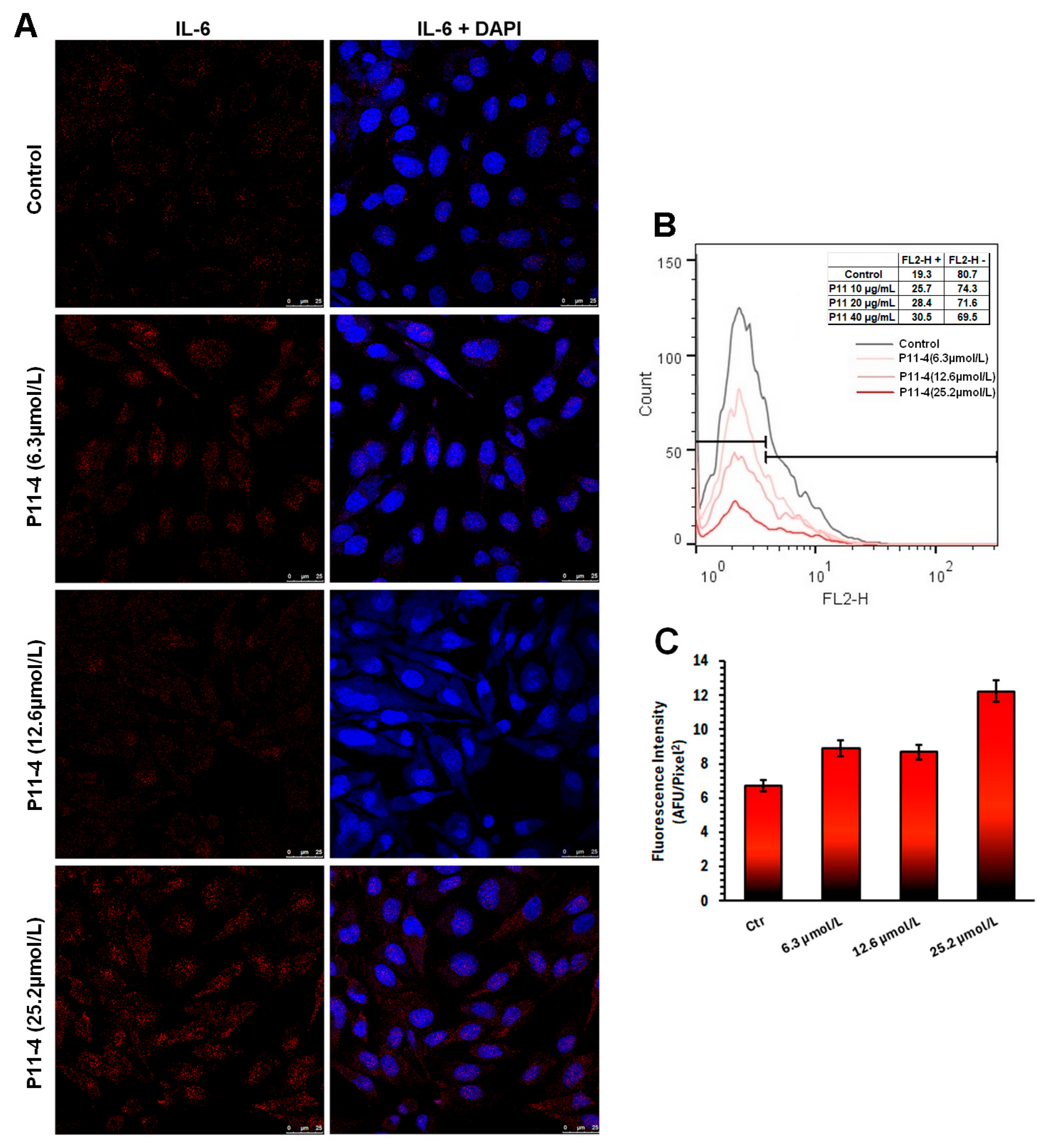 Immunofluorescence assays were performed to analyze the IL-6 expression modulated by P11-4 before and after cellular stimulation. For this purpose, cell lines were cultured on circular coverslips with an 18 mm diameter, at a density of 1.0 × 104 cells per coverslip, and maintained in 12-well culture plates under standard conditions until reaching 70% confluence. Then, the cells were stimulated by 6.3, 12.6, and 25.2 µmol/L of the P11-4 peptide for 6 h. After the stimulation period, the culture medium was carefully removed from the wells, the cells were washed with PBS buffer, and subjected to IL-6 labeling. Cells were incubated for 1 h at 4 °C with a mouse monoclonal anti-IL-6 primary antibody (Santa Cruz Biotechnology, USA), diluted 1:100 (v/v) in PBS buffer containing 1.5% (w/v) albumin. Following this incubation, cells were washed with PBS buffer, and the wells were treated with an Alexa Fluor 594-conjugated anti-mouse secondary antibody (Molecular Probes) diluted 1:200 (v/v) in PBS buffer containing 1% (w/v) albumin. Cells remained in contact with the antibody for 40 min at 4 °C in the dark.