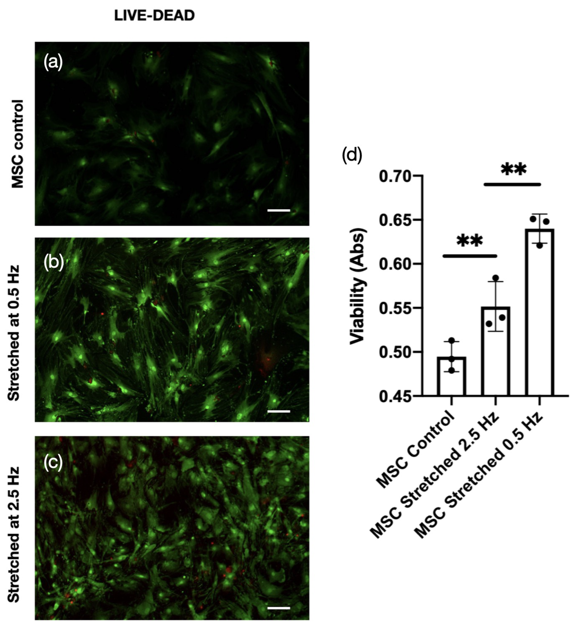 We previously demonstrated that culturing hMSCs within peptide hydrogels under static conditions enhances cell growth compared to conventional 2D culture. In the present study, we assessed cell viability under dynamic mechanical stimulation in 3D hydrogels using MTT assays at two different strain regimens: 0.5 Hz with 10% strain and 2.5 Hz with 1% strain (