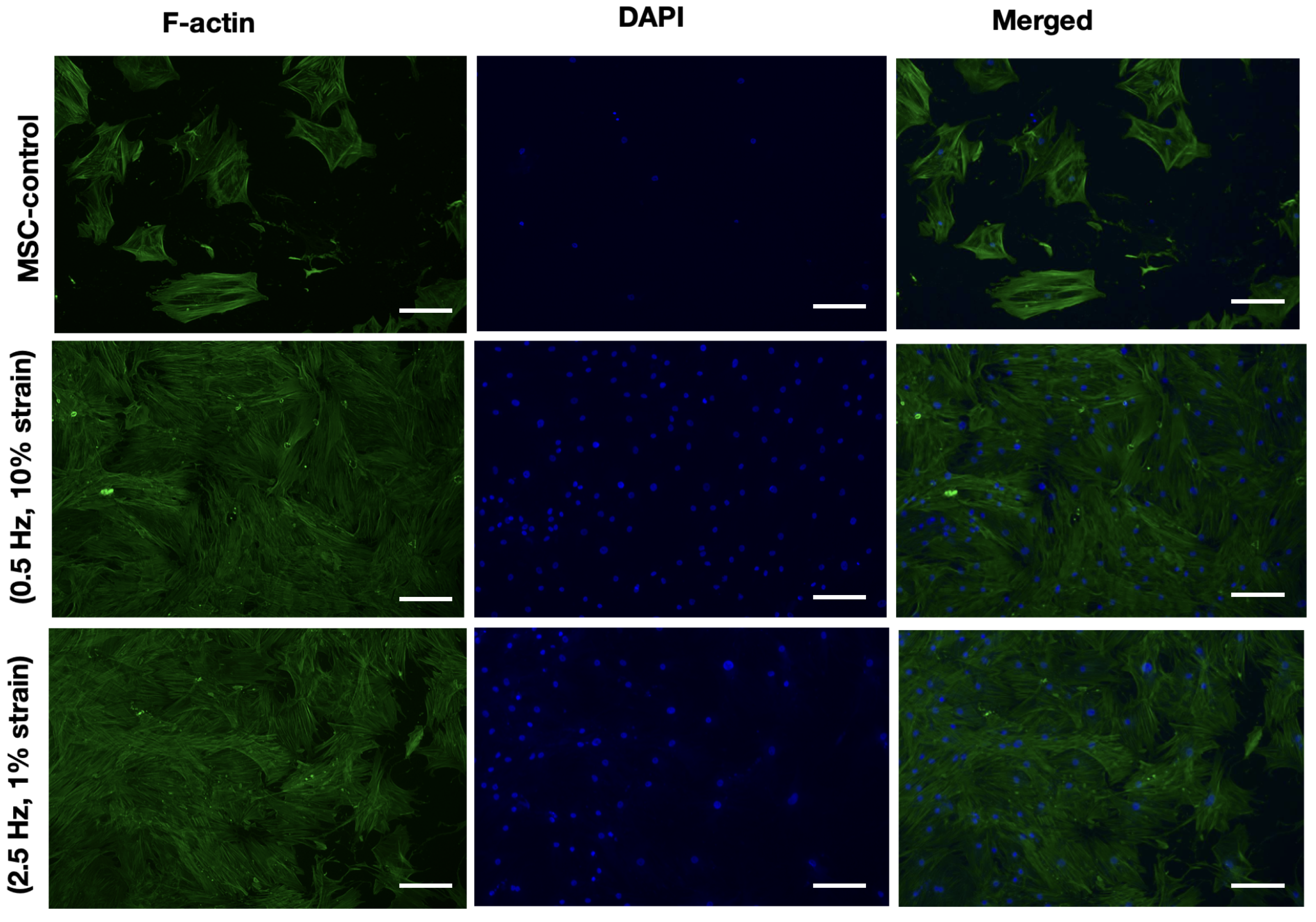 To measure how cyclic mechanical loading influences MSCs, fluorescence micrographs of F-actin and DAPI-labeled cells under different strain conditions were analyzed. The three experimental groups consisted of unstimulated MSC controls, cells exposed to 10% strain at 0.5 Hz, and cells subjected to 1% strain at 2.5 Hz. Image analysis was performed in Fiji/ImageJ to assess three primary mechanobiological parameters: cytoskeletal alignment, F-actin intensity, and cell density (