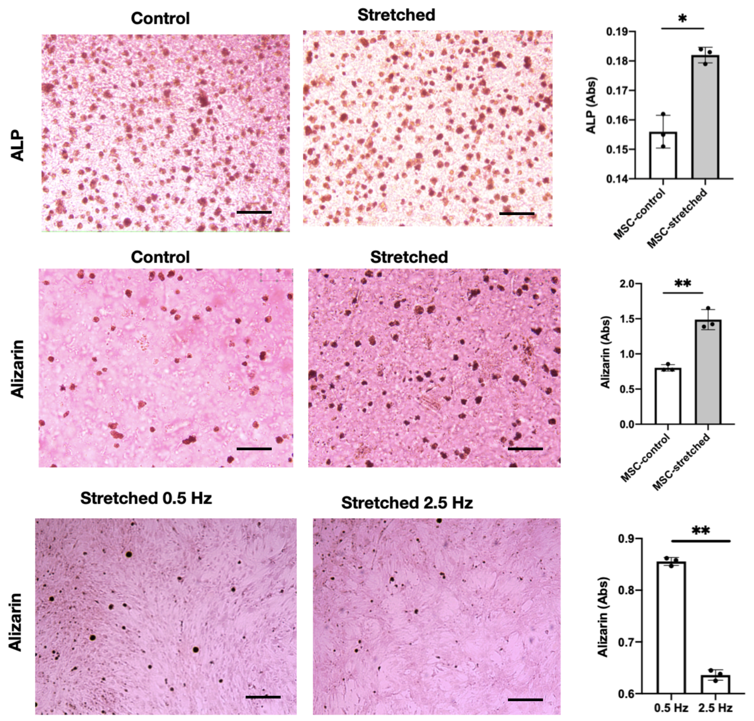 To evaluate whether cyclic mechanical stretching enhances osteogenic differentiation in mesenchymal stem cells (MSCs), both alkaline phosphatase (ALP) and Alizarin Red S (ARS) staining assays were performed after 14 days of culture under the optimized stretch condition (0.5 Hz, 10% strain).
