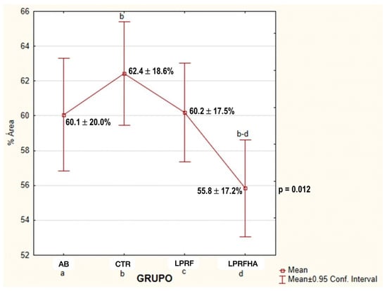 Furthermore, the LPRF and AB groups showed similar NBF results, with values of 60.2% and 60.1%, respectively. These similarities are reflected in the multiple comparison analyses (Figure 5), where significant differences between groups are detailed (p = 0.012).