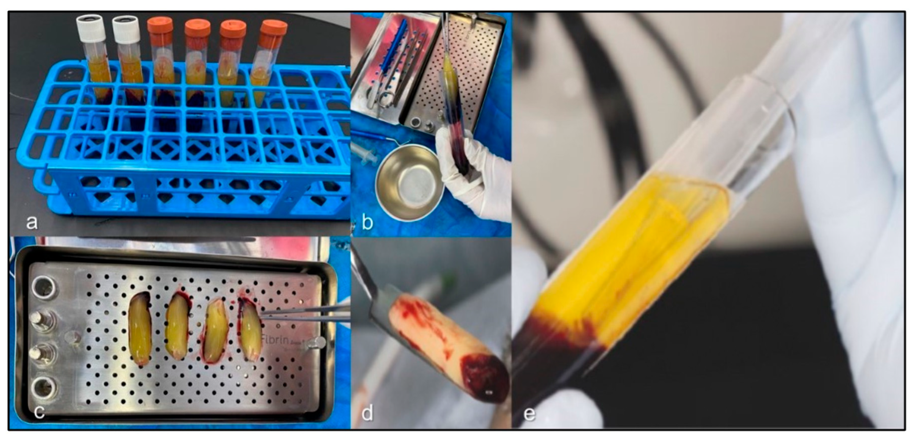 - Choukroun, J.; Diss, A.; Simonpieri, A.; Girard, M.O.; Schoeffler, C.; Dohan, S.L.; Dohan, A.J.; Mouhyi, J.; Dohan, D.M. Platelet-rich fibrin (PRF): A second-generation platelet concentrate. Part IV: Clinical effects on tissue healing. Oral Surg. Oral Med. Oral Pathol. Oral Radiol. Endod. 2006, 101, e56–e60. [Google Scholar] [CrossRef]