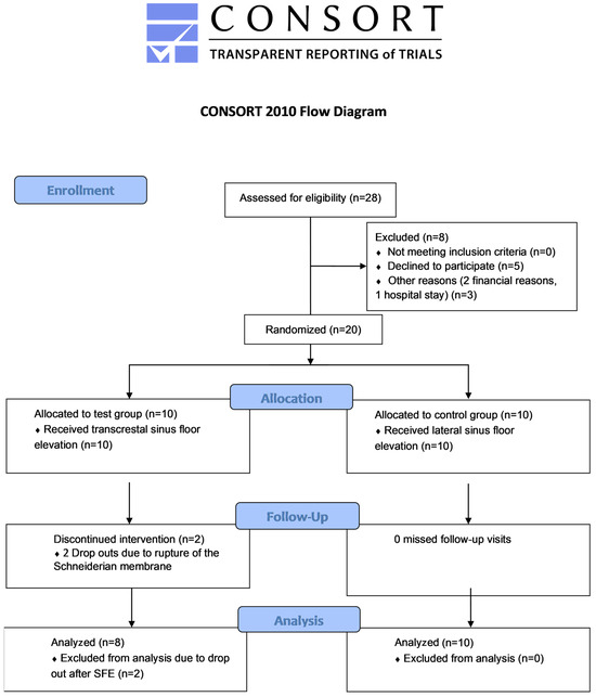 ®-System. Grafting in both groups was performed using a ß-TCP–HA combination, which was biofunctionalized with a cross-linked hyaluronic acid. For both access techniques, a cross-linked collagen membrane covered either the bone window or transcrestal osteotomy. For second-stage surgery, a second CBCT was used to assess the bone volume and possible implant positioning to compare it with the baseline CBCT. Bone cores were harvested at implant placement and evaluated histomorphometrically. Patients were followed for 1-year post-op for survival rate estimation. Non-superiority was hypothesized for both surgical methods; thus, the primary outcome measure assessed different discomfort levels using patient-reported outcome measures (PROMs) for each therapeutic approach. Secondary outcomes were the volume change in subantral bone after sinus floor elevation, the chance of placing a 10 mm long implant with no need for additional augmentation, histological evaluation of the newly gained tissue, and implant integration and one-year survival.