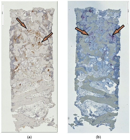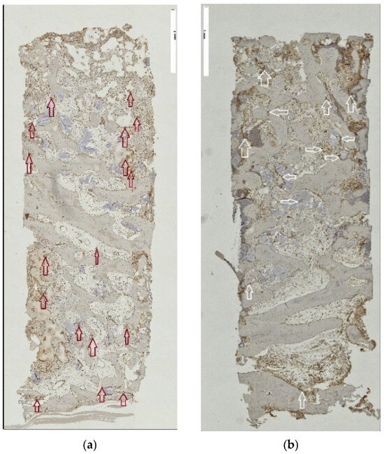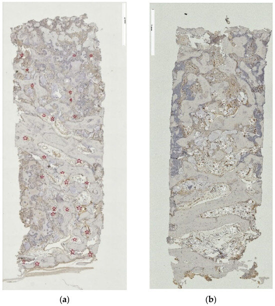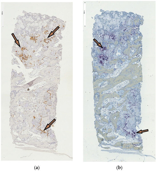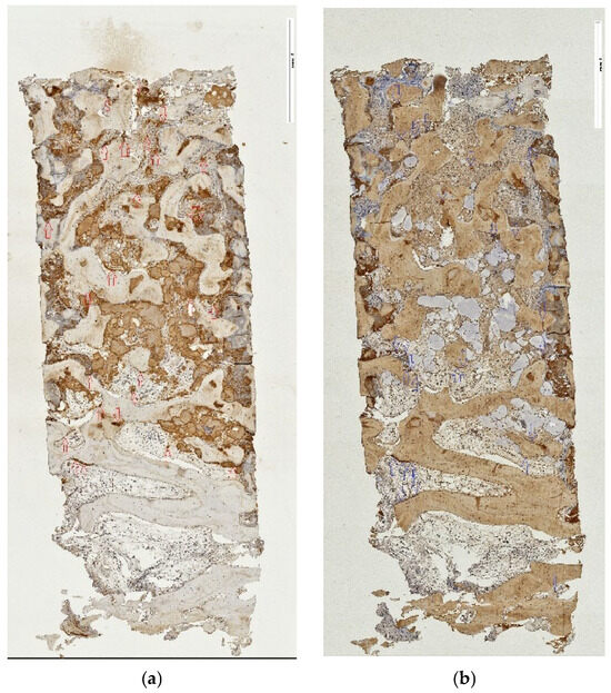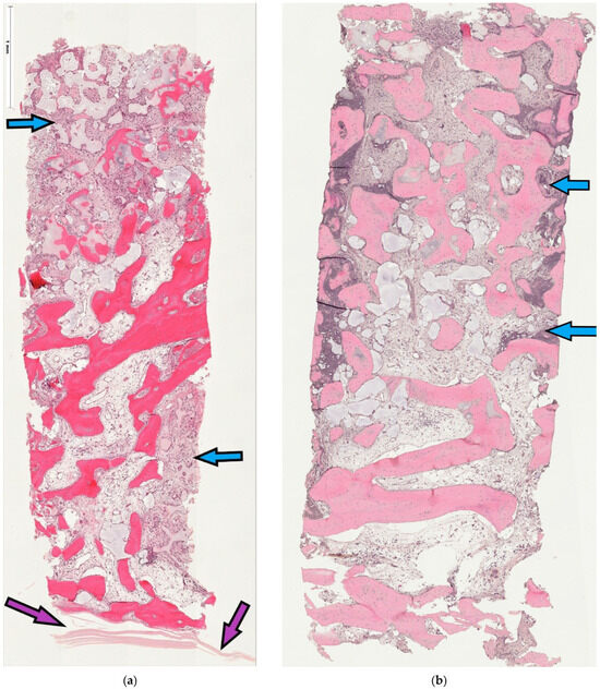 n = 18/20) qualified for implant placement at five months, and ten donated tissue biopsies for microscopic analysis. Primary outcome reporting using PROMs was discarded due to truncated patient enrollment. The secondary parameter, placement of a ≥10 mm long implant without additional augmentation, was achieved for nine sites/patients from the lSFE control group. All patients from the tSFE test group received an implant that was positioned alongside additional augmentation. In both groups, all implants integrated and were functionally loaded. A total of 10 core samples (3 from the tSFE group and 7 from the lSFE group) were obtained and analyzed. Microscopically, new bone formation appeared consistent in all obtained samples. Specimens revealed advanced and ongoing osteogenesis, with most histological markers reacting positively in the immunohistochemical (IHC) staining. The histomorphometric calculation revealed that a mean of 61.17 ± 16.55% of the total area was occupied by newly formed bone, 30.43 ± 10.09% by connective tissue and 8.92 ± 15.29% by residual graft substitute. One-year follow-up of the loaded implants showed a 100% implant survival rate.