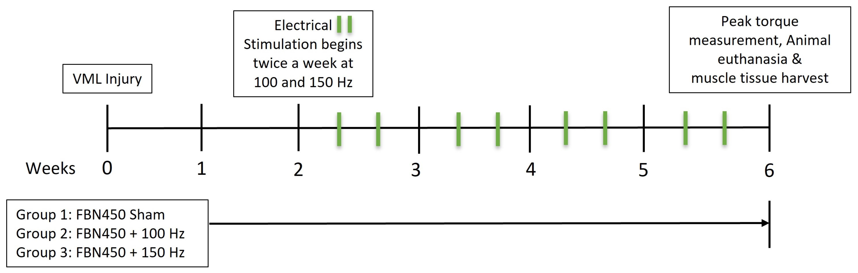 We hypothesized that the regenerative therapy (FBN450 hydrogel) would support myofiber hyperplasia, while the rehabilitation technique (EST) would concurrently drive hypertrophy of these regenerated fibers. This combinatorial approach was expected to yield superior muscle mass and strength. Therefore, the objective of this study was to determine the extent of functional repair and regeneration following the combined application of FBN450 and EST in a rodent VML model.