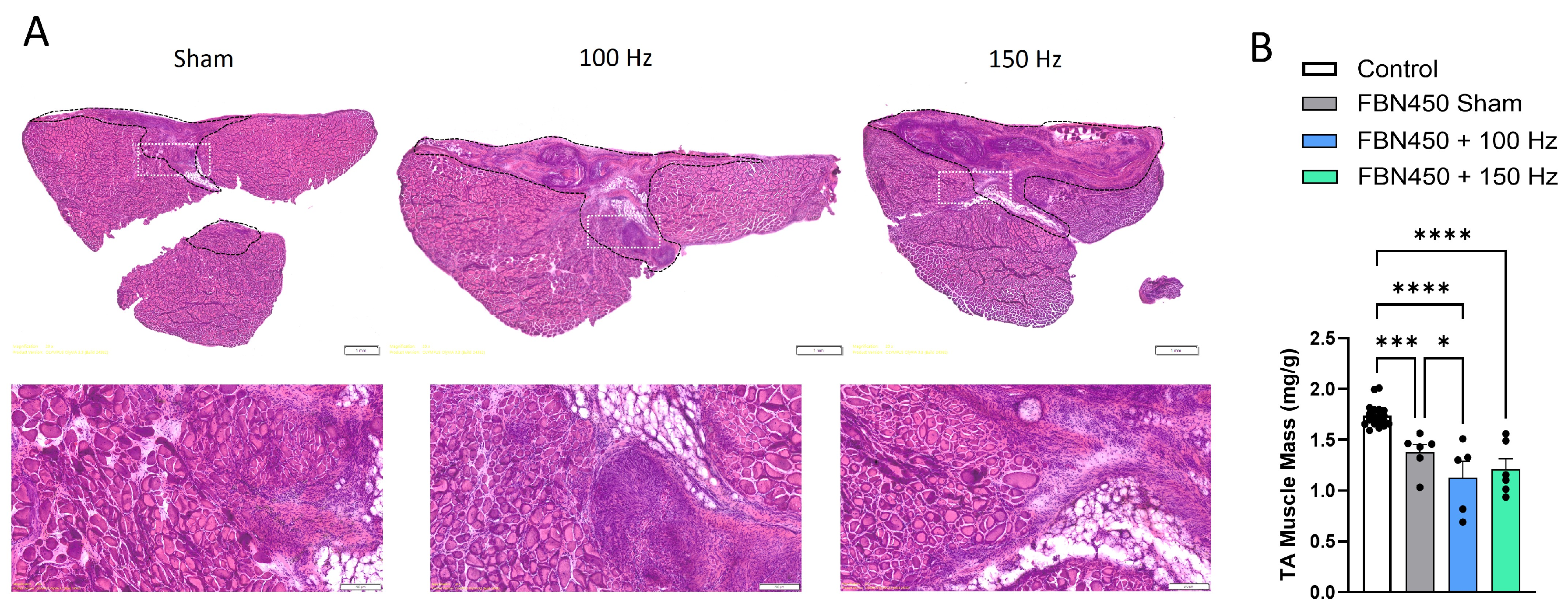 Building upon the findings of this study, several future directions are warranted to optimize the selective synergy between the FBN450 hydrogel and EST. A critical next step is to investigate whether the electrical stimulation protocol should be delayed, perhaps beginning at 21 days post-injury rather than 14 days. This extended undisturbed period might provide the regenerative therapy ample opportunity to fully integrate with the remaining musculature and establish a robust cellular niche before being subjected to mechanical strain due to EST. By allowing the hydrogel to elicit its full regenerative capacity and stabilize the defect site, a later introduction of EST may yield the functional improvements that were absent in the current study.