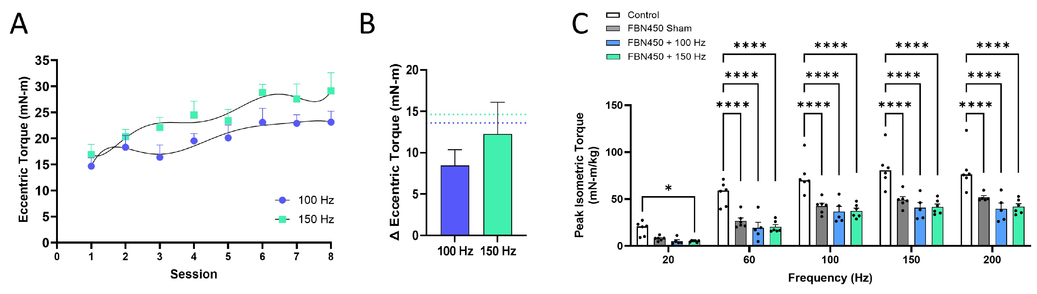 13]. In a previous study, we optimized an electrical-stimulation eccentric-contraction training (EST) program by implementing the regimen 14 days post-VML injury for 4 weeks. Briefly, the training program consisted of altering the mechanical load on VML-injured muscles by modulating the stimulation frequency (50 Hz, 100 Hz, & 150 Hz) for a total of 20 eccentric contractions per bout. Our results show that the implementation of the electrical stimulation protocol at both 100 Hz and 150 Hz improved muscle mass (~37% and ~39%, respectively) and mean myofiber CSA. However, muscle function was only improved with 150 Hz stimulation (by ~34%) compared to a non-trained VML sham group [